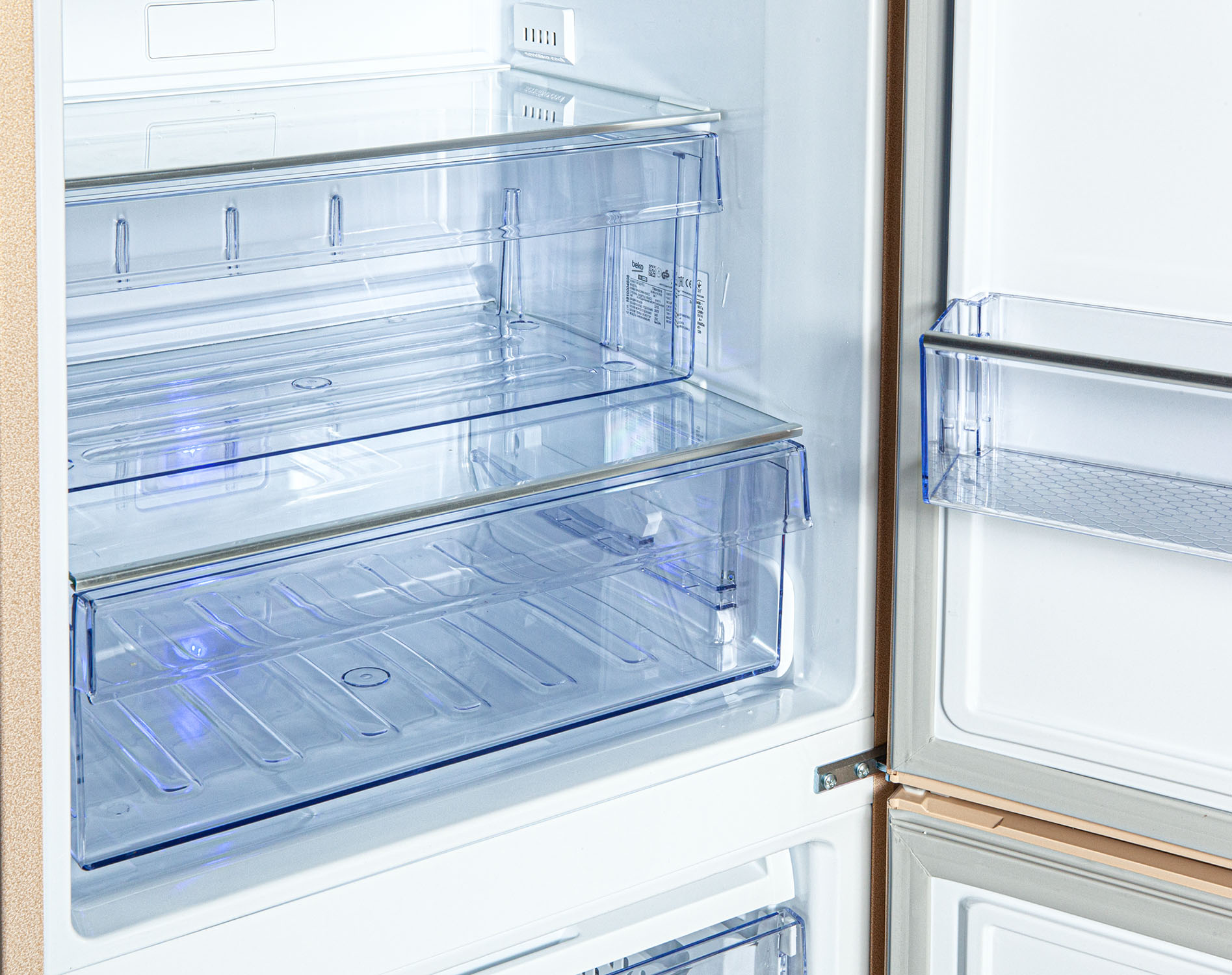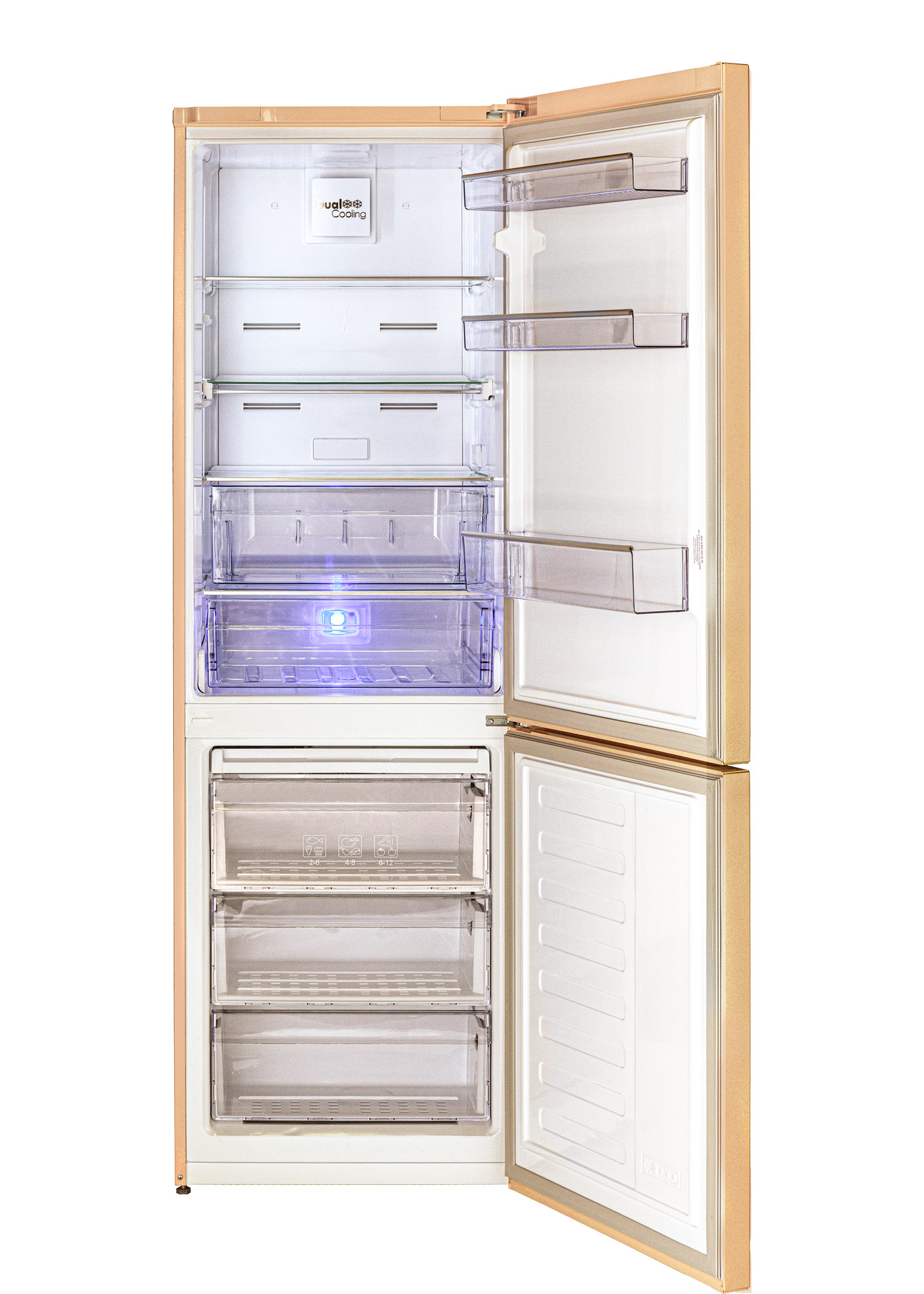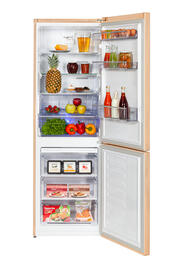 Двухкамерный холодильник бежевого цвета с нижней морозильной камерой, режимом экономии энергии «Отпуск» и классом энергоэффективности А+. Система двухконтурного охлаждения NoFrost Dual Cooling (Ноу Фрост) поддерживает оптимальную температуру холодильной и морозильной камер независимо друг от друга, поэтому продукты дольше остаются свежими, запахи не смешиваются, а холодильник не надо размораживать. Технология Active Fresh Blue Light с синей подсветкой в холодильнике продлевает свежесть овощей и фруктов и сохраняет их пользу и витамин С. Двери холодильной и морозильной камер имеют антибактериальный уплотнитель, который предотвращает рост и распространение бактерий и легко чистится.