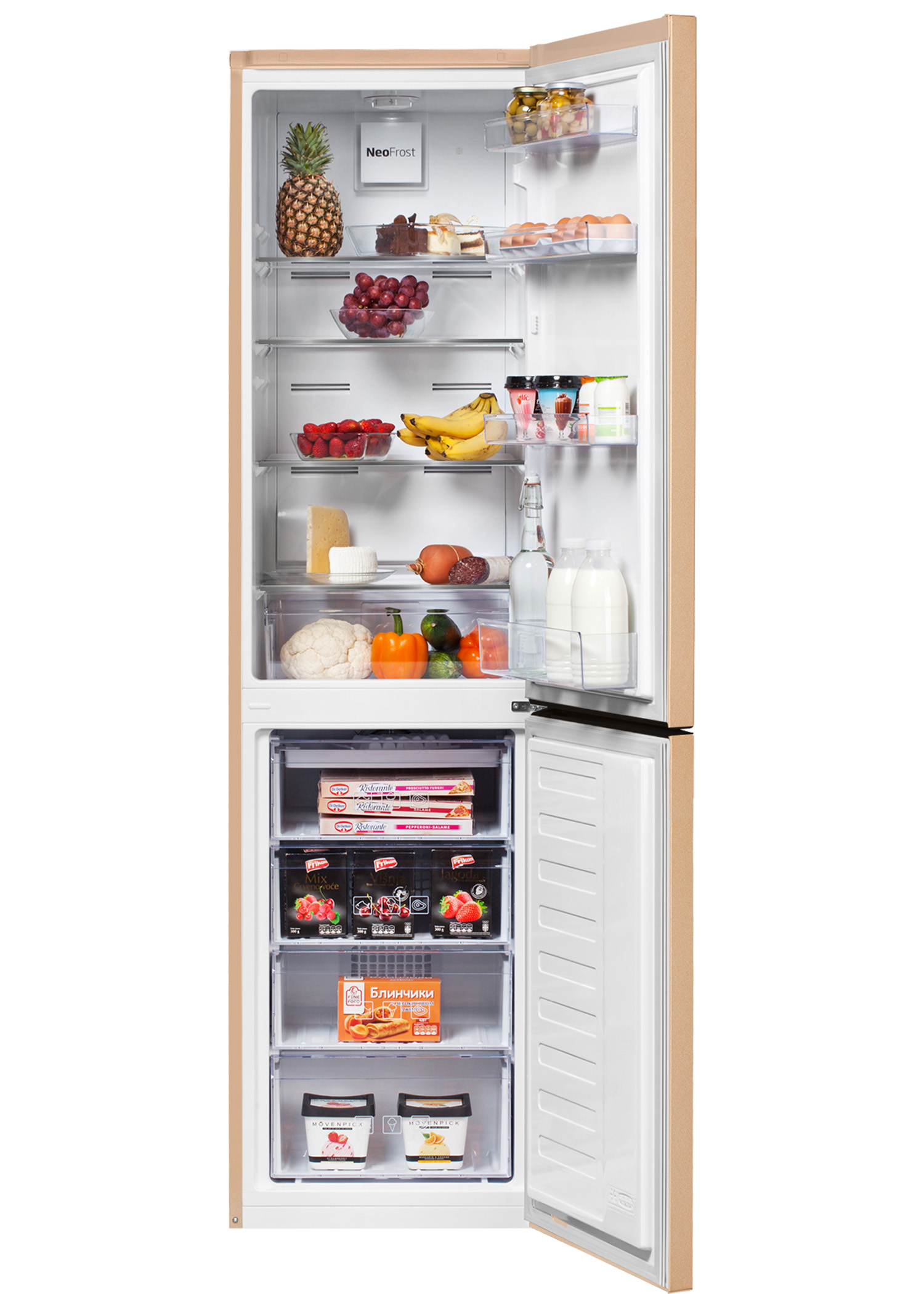 Двухметровый бежевый холодильник с нижней морозильной камерой имеет общий объем 335 л и класс энергоэффективности А+. Двухкамерный холодильник оснащен системой охлаждения NoFrost Dual Cooling (Ноу Фрост), которая обеспечивает раздельное охлаждение холодильной и морозильной камер и снимает необходимость регулярной разморозки.