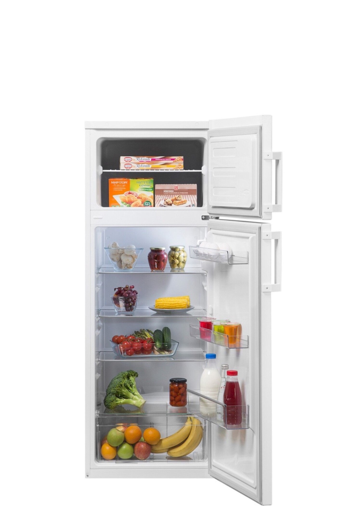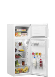 Холодильник со статической системой охлаждения, экономичной LED-подсветкой и компактной морозильной камерой на две полки. Холодильник оснащен отсеком для свежих овощей и фруктов, тремя полками на двери и специальными антибактериальными прокладками на обеих дверях.