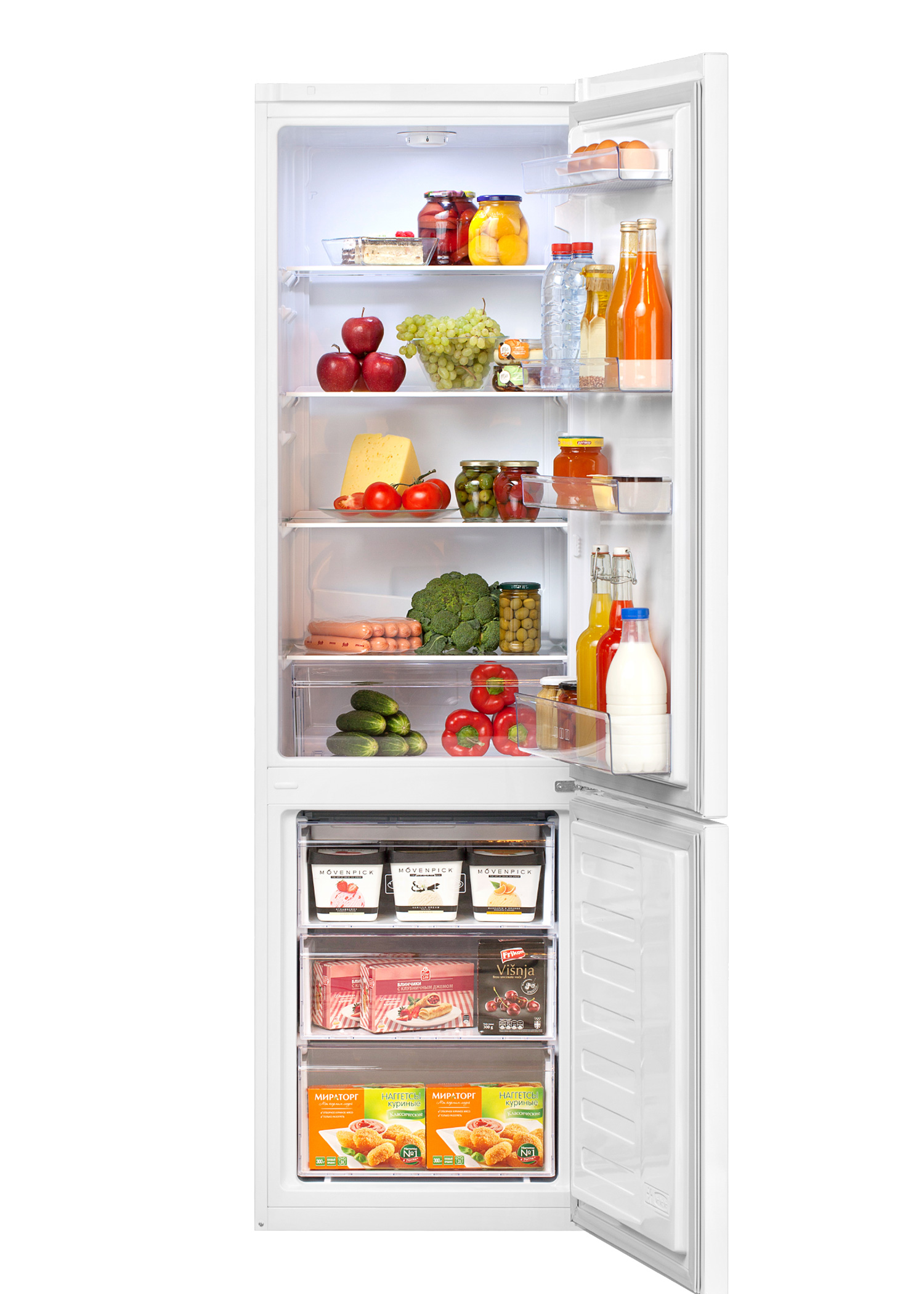 Белый холодильник с нижней морозильной камерой, статической системой охлаждения и удобным механическим управлением. Холодильник имеет класс энергоэффективности А+ и низкий уровень шума, а при случайном отключении электричества он поддерживает низкую температуру в автономном режиме в течение 18 часов. Перенавешиваемые двери можно крепить к холодильнику как с левой, так и с правой стороны для удобного использования.