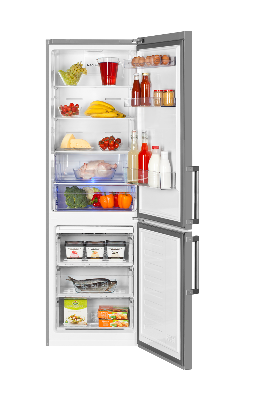 Холодильник с системой охлаждения NoFrost Dual Cooling, голубым освещением Fresh Blue Light для сохранения свежести овощей и фруктов, сенсорным управлением и экономичной боковой LED-подсветкой. Функция быстрой заморозки позволит удобно наполнять морозильную камеру новыми продуктами, не влияя на температуру внутри.