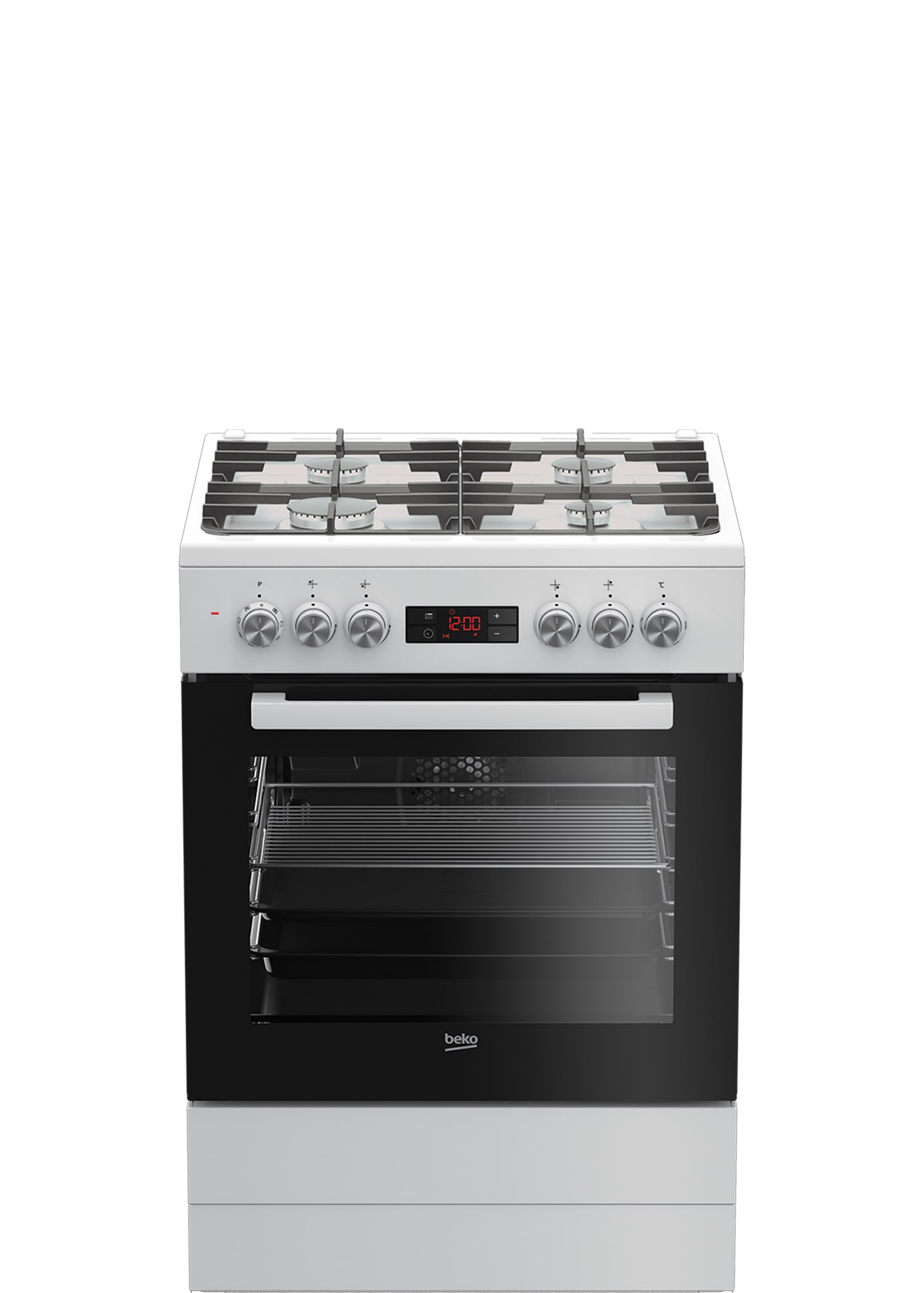 Комбинированная плита белого цвета с газовой варочной поверхностью и электрическим духовым шкафом. Газовые конфорки оснащены автоматическим электроподжигом и газ-контролем для безопасного приготовления любых блюд. Духовка объемом 72 л предлагает несколько режимов работы, включая 3D-нагрев, конвекцию и гриль, и оснащена телескопическими направляющими для противней. Плита имеет ширину 60 см, блокировку от случайного нажатия и класс энергопотребления А.