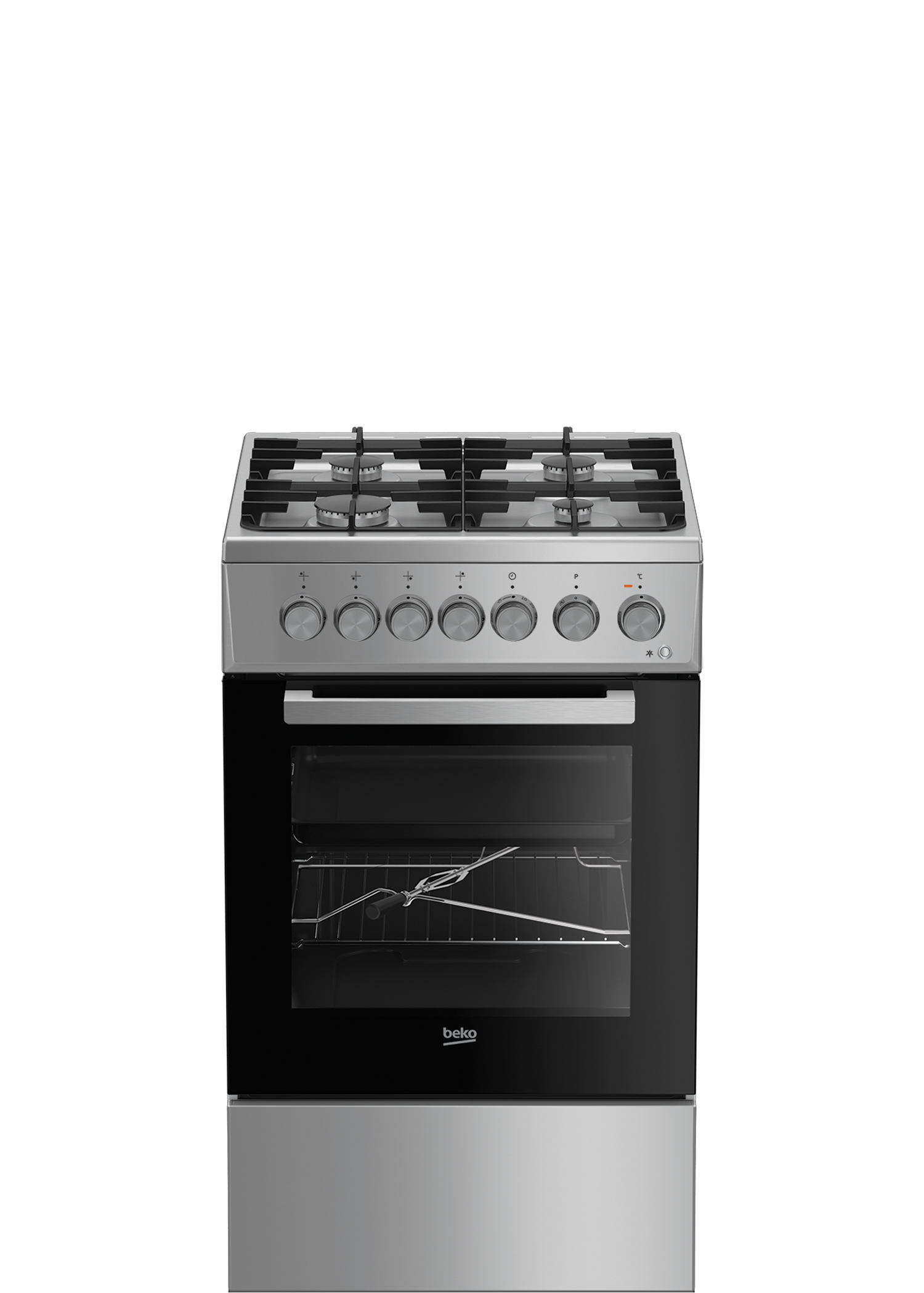 Серебристая комбинированная плита шириной 50 см с газовой варочной поверхностью и электрическим духовым шкафом. Газовые конфорки оснащены электроподжигом с помощью кнопки. Электрическая духовка объемом 55 л имеет режимы верхнего и нижнего нагрева, гриля. Плита имеет класс энергопотребления А, удобный термостат, который позволяет установить точную температуру внутри духовки, и механический таймер с автоматическим отключением.