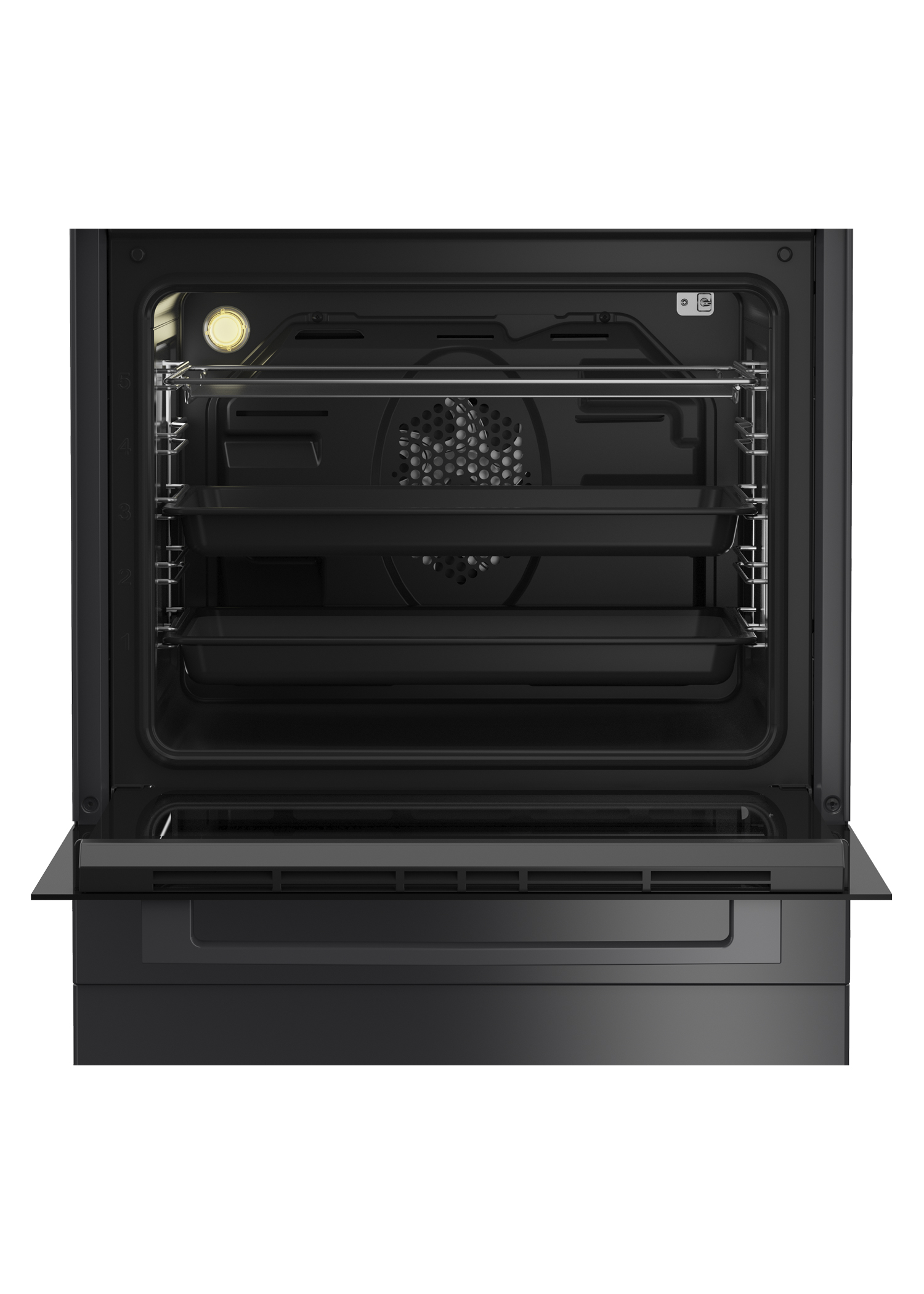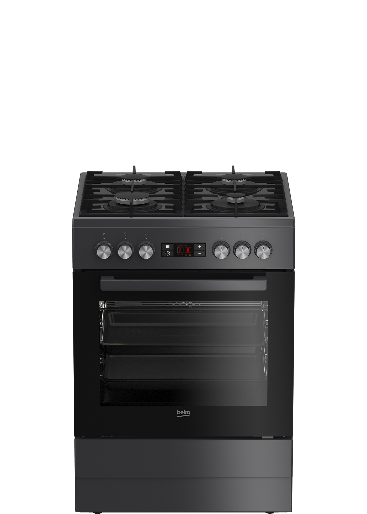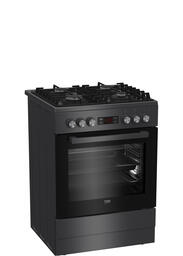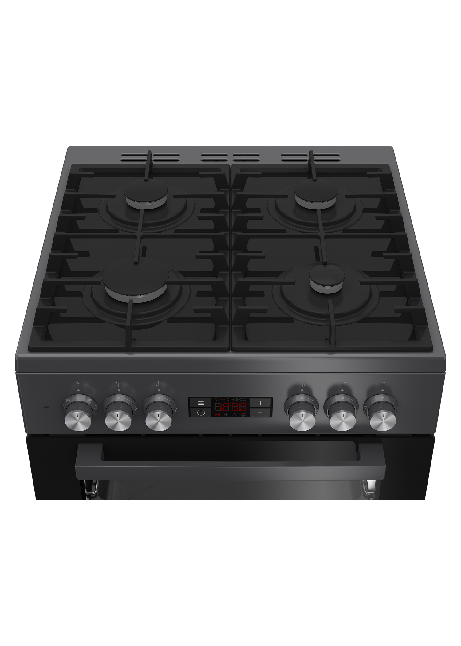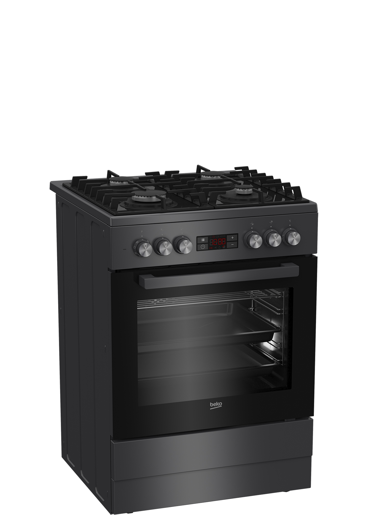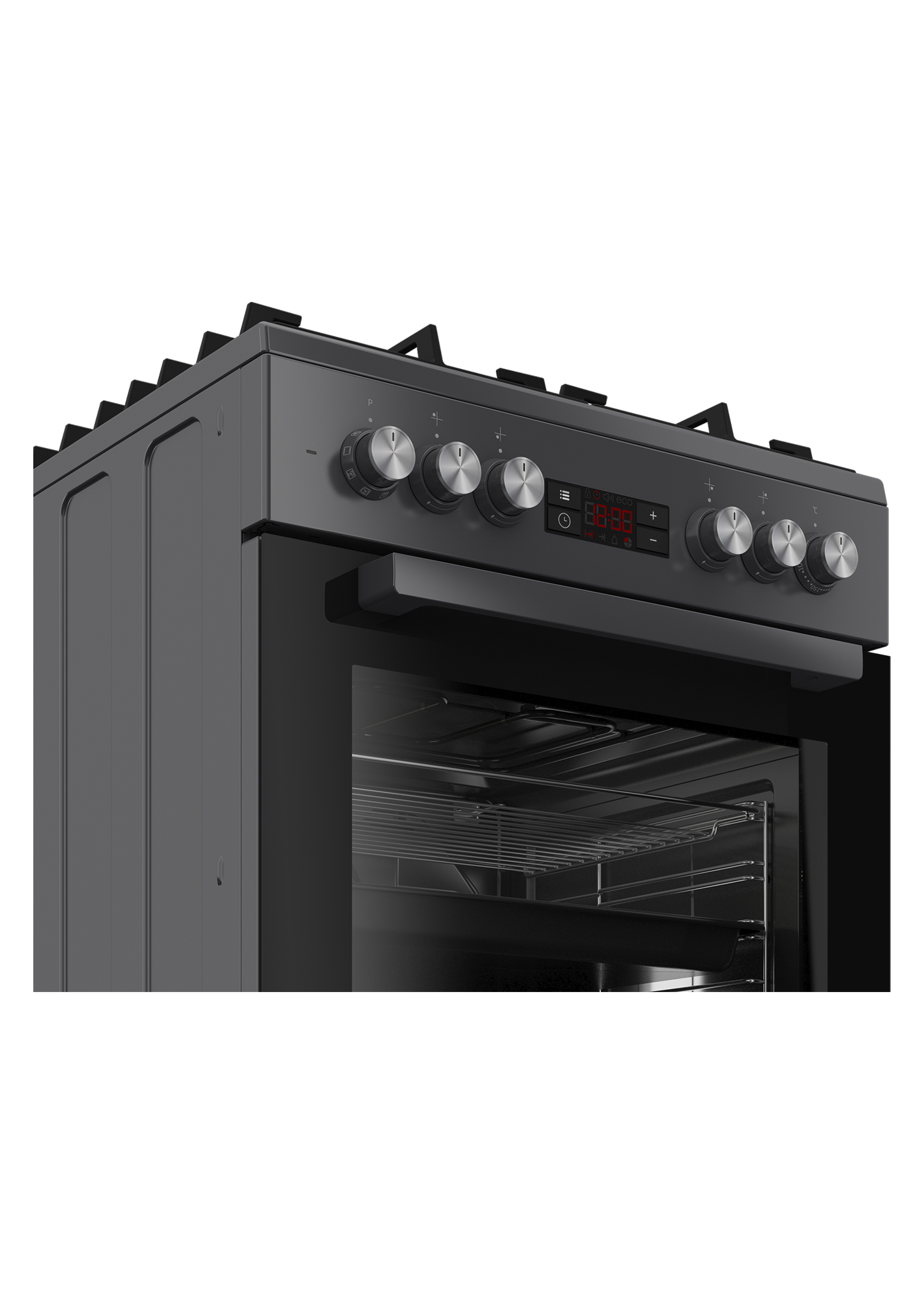 Комбинированная плита выполнена в элегантном цвете антрацит и поставляется с двумя стандартными противнями и решеткой. Газовая варочная поверхность плиты оснащена 4 конфорками с автоматическим электроподжигом и системой газ-контроля, которая прекращает подачу газа, если пламя случайно потухнет, гарантируя полную безопасность. Многофункциональный духовой шкаф плиты объемом 72 л предлагает режимы с верхним и нижнем нагревом, грилем и конвекцией, режим разморозки и 3D-приготовления, а также функцию очистки паром.