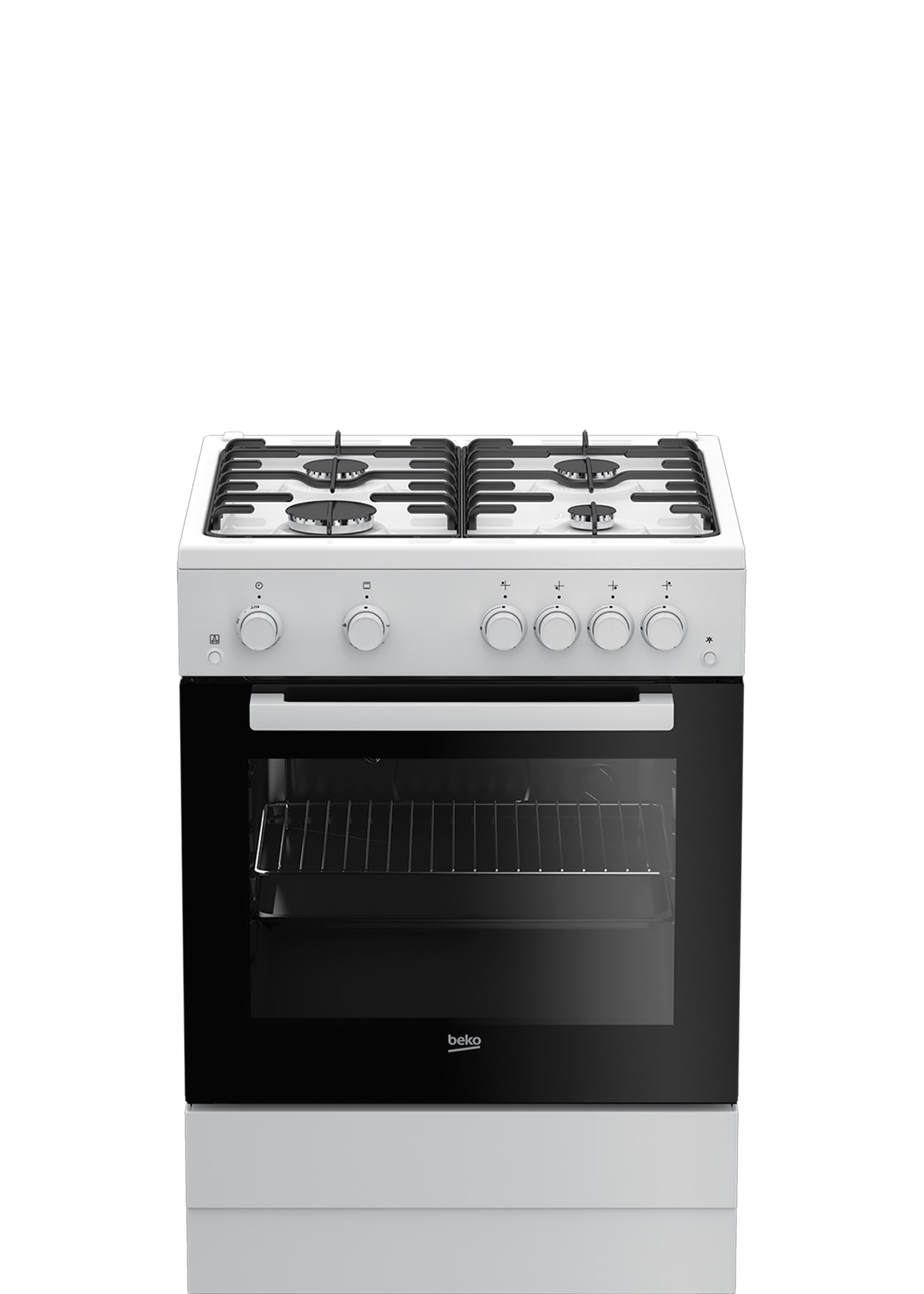 Белая газовая плита шириной 60 см с 4 конфорками, удобным управлением и механическим таймером. Конфорки и духовой шкаф оснащены электроподжигом, который включается нажатием на кнопку. Газовая духовка объемом 55 л имеет удобную подсветку и газ-контроль, а также несколько режимов работы, включая гриль. В комплект входят эмалированный противень, решетка и вертел для гриля, а внизу плиты расположен ящик для хранения посуды.