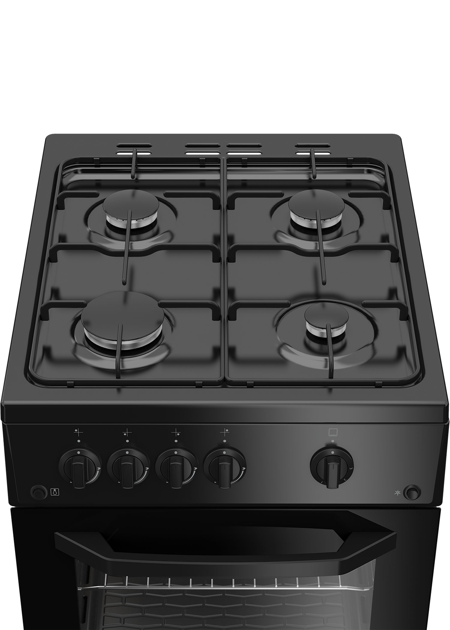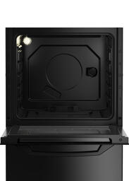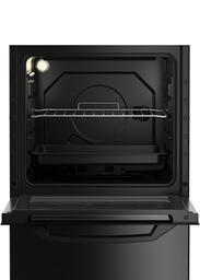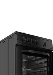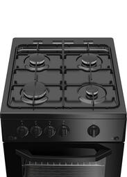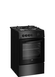 Черная газовая плита шириной 50 см с электроподжигом конфорок и духового шкафа. Духовка объемом 56 л оснащена удобным термостатом и газ-контролем, который прекращает подачу газа, если пламя случайно потухнет. Температура внутри духовки может достигать 300 °С, а эмалированное покрытие легко очищается от пятен жира после приготовления блюд. Внизу плита оснащена вместительным ящиком с откидной крышкой для удобного хранения посуды.