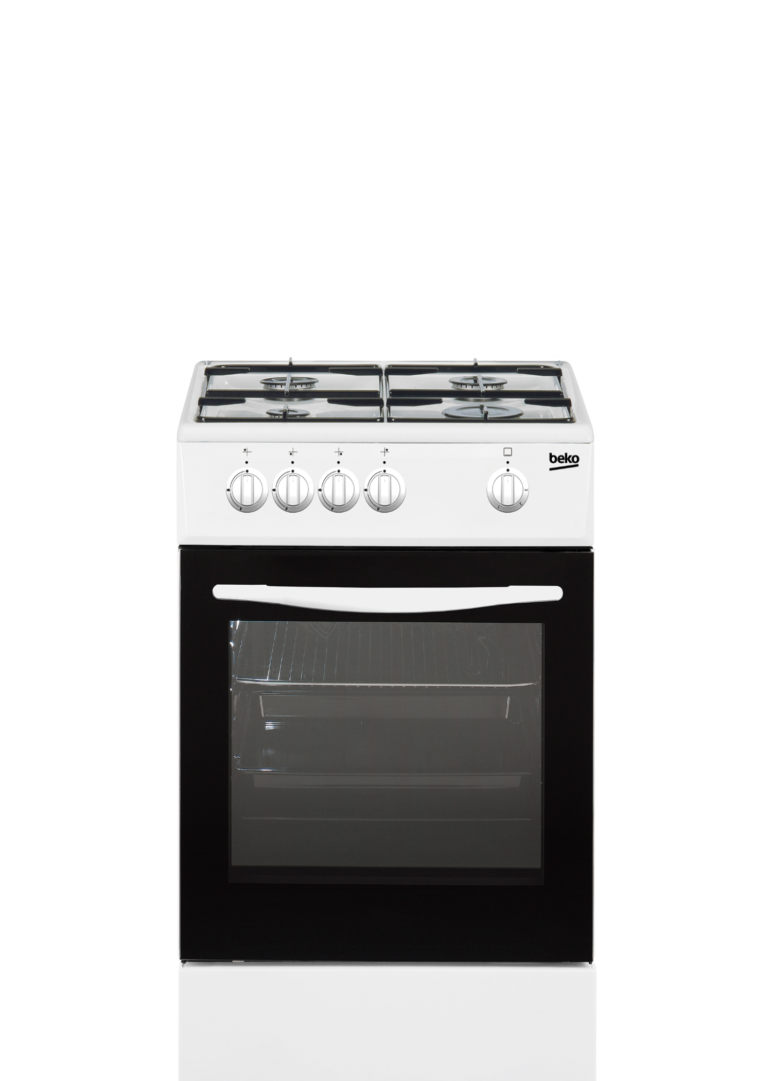 Белая газовая плита шириной 50 см с простым управлением и 4 конфорками разного диаметра. Газовый духовой шкаф объемом 56 л оснащен дверцей с двойным стеклом, газ-контролем для безопасности и имеет эмалированное покрытие, которое легко чистится после использования духовки. Температура внутри духовки может достигать 300 °С. Ножки плиты можно регулировать по высоте для удобства использования на любой кухне.