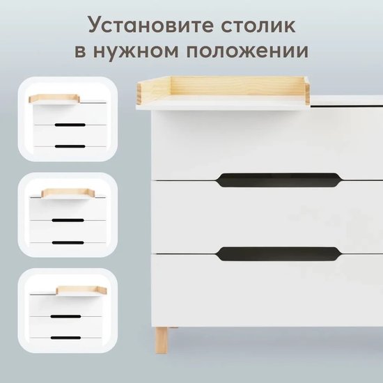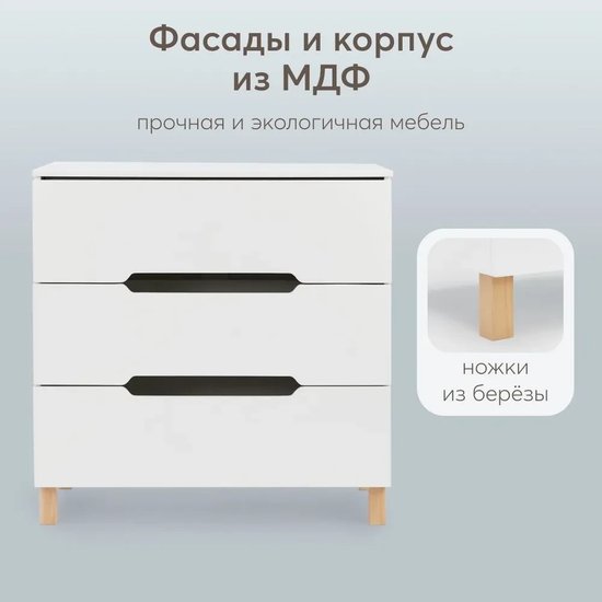 ✅Ключевые характеристикиКомод предназначен для хранения детских вещей и ухода за малышом; имеет компактные размеры 83,8х43,5х85 см; что позволяет экономить пространство в комнате. Изготовлен из ЛДСП с ножками из натурального дерева; оснащён тремя вместительными ящиками с внутренними размерами 74,2х36,5х15 см. Вес изделия без упаковки составляет 39 кг; гарантийный срок 18 месяцев.✅Преимущества и отличияЯщики оборудованы шариковыми направляющими и доводчиками для плавного и бесшумного открывания; что особенно важно для сохранения спокойствия ребёнка. В комплект входит съёмный пеленальный столик с размерами 48,7х73х7 см; который удобно использовать для ухода за малышом. Конструкция комода устойчива и безопасна для детской комнаты.✅ПрактичностьКомод идеально подходит для небольших помещений благодаря компактным габаритам и эргономичному дизайну; который легко вписывается в любой интерьер. Материал ЛДСП обеспечивает долговечность и простоту ухода; а натуральное дерево в ножках придаёт изделию дополнительную прочность и эстетическую привлекательность.✅УникальностьОсобенностью модели является сочетание функциональности и стильного дизайна с использованием натуральных материалов. Плавное открывание ящиков с доводчиками и наличие съёмного пеленального столика делают этот комод удобным и практичным решением для родителей; заботящихся о комфорте и безопасности ребёнка.✅Ключевые характеристикиКомод предназначен для хранения детских вещей и ухода за малышом; имеет компактные размеры 83,8х43,5х85 см; что позволяет экономить пространство в комнате. Изготовлен из ЛДСП с ножками из натурального дерева; оснащён тремя вместительными ящиками с внутренними размерами 74,2х36,5х15 см. Вес изделия без упаковки составляет 39 кг; гарантийный срок 18 месяцев.✅Преимущества и отличияЯщики оборудованы шариковыми направляющими и доводчиками для плавного и бесшумного открывания; что особенно важно для сохранения спокойствия ребёнка. В комплект входит съёмный пеленальный столик с размерами 48,7х73х7 см; который удобно использовать для ухода за малышом. Конструкция комода устойчива и безопасна для детской комнаты.✅ПрактичностьКомод идеально подходит для небольших помещений благодаря компактным габаритам и эргономичному дизайну; который легко вписывается в любой интерьер. Материал ЛДСП обеспечивает долговечность и простоту ухода; а натуральное дерево в ножках придаёт изделию дополнительную прочность и эстетическую привлекательность.✅УникальностьОсобенностью модели является сочетание функциональности и стильного дизайна с использованием натуральных материалов. Плавное открывание ящиков с доводчиками и наличие съёмного пеленального столика делают этот комод удобным и практичным решением для родителей; заботящихся о комфорте и безопасности ребёнка.