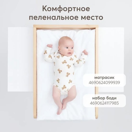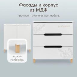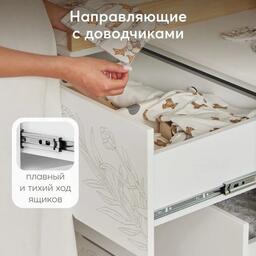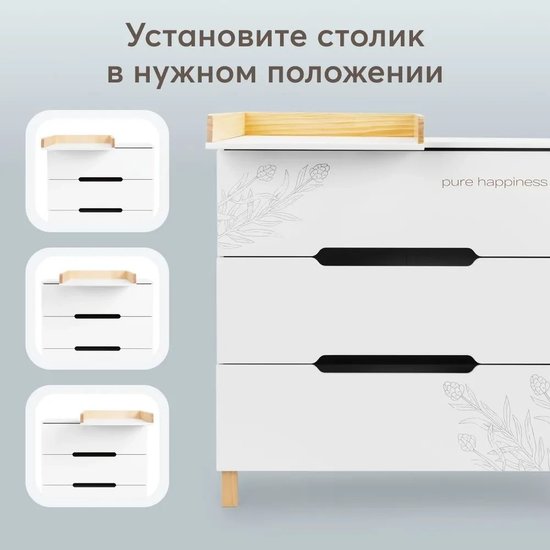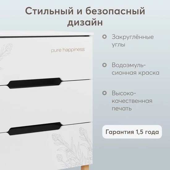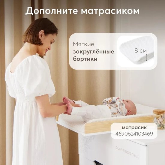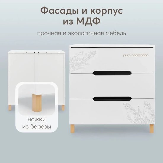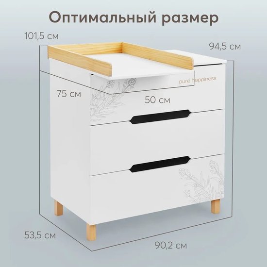 ✅Ключевые характеристикиКомод предназначен для детской комнаты и оснащён тремя просторными ящиками; которые обеспечивают удобное хранение одежды; пелёнок и других необходимых вещей. Изготовлен из ЛДСП и натурального дерева; что гарантирует прочность и долговечность конструкции. Размеры комода составляют 90,2х53,5х94,5 см; а с пеленальным столиком - 90,2х75х101,5 см.✅Преимущества и отличияЯщики оборудованы шариковыми направляющими и доводчиками; что обеспечивает плавное и бесшумное открывание; не нарушая покой ребёнка. Ножки из натурального дерева придают устойчивость и надёжность. В комплект входит съёмный пеленальный столик с бортиками для дополнительной безопасности малыша.✅ПрактичностьСъёмный пеленальный столик облегчает процесс ухода за ребёнком; позволяя быстро и удобно менять пелёнки. Эргономичный дизайн комода гармонично впишется в любой интерьер детской комнаты. Конструкция комода устойчива; что важно для безопасности ребёнка.✅УникальностьОсобенностью модели является сочетание натуральных материалов и современных механизмов открывания ящиков; что обеспечивает комфорт и долговечность. Съёмный пеленальный столик с бортиками выделяет этот комод среди аналогичных решений; делая уход за малышом максимально удобным и безопасным.✅Ключевые характеристикиКомод предназначен для детской комнаты и оснащён тремя просторными ящиками; которые обеспечивают удобное хранение одежды; пелёнок и других необходимых вещей. Изготовлен из ЛДСП и натурального дерева; что гарантирует прочность и долговечность конструкции. Размеры комода составляют 90,2х53,5х94,5 см; а с пеленальным столиком - 90,2х75х101,5 см.✅Преимущества и отличияЯщики оборудованы шариковыми направляющими и доводчиками; что обеспечивает плавное и бесшумное открывание; не нарушая покой ребёнка. Ножки из натурального дерева придают устойчивость и надёжность. В комплект входит съёмный пеленальный столик с бортиками для дополнительной безопасности малыша.✅ПрактичностьСъёмный пеленальный столик облегчает процесс ухода за ребёнком; позволяя быстро и удобно менять пелёнки. Эргономичный дизайн комода гармонично впишется в любой интерьер детской комнаты. Конструкция комода устойчива; что важно для безопасности ребёнка.✅УникальностьОсобенностью модели является сочетание натуральных материалов и современных механизмов открывания ящиков; что обеспечивает комфорт и долговечность. Съёмный пеленальный столик с бортиками выделяет этот комод среди аналогичных решений; делая уход за малышом максимально удобным и безопасным.