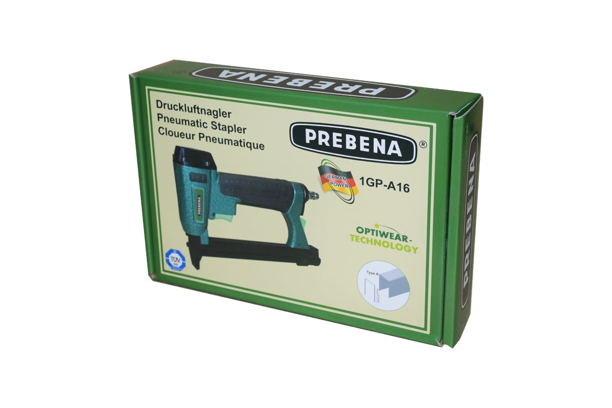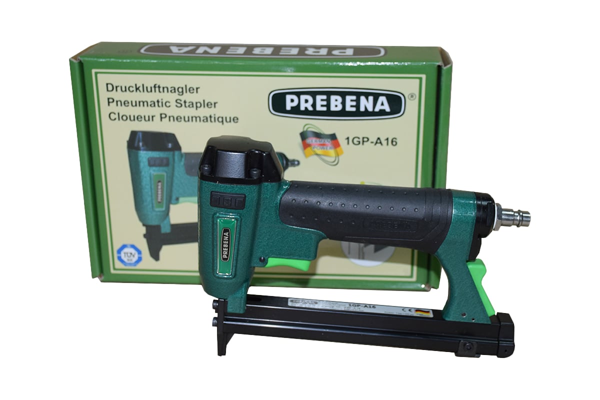 Prebena 1GP-A16 — профессиональный пневматический степлер, разработанный специально для обивочных работ в мебельной промышленности. Он используется со скобами типа A (ширина спинки — 12,7 мм) длиной от 4 до 16 мм, что делает его универсальным инструментом для различных типов материалов: от плотной обивки до лёгких нетканых полотен.