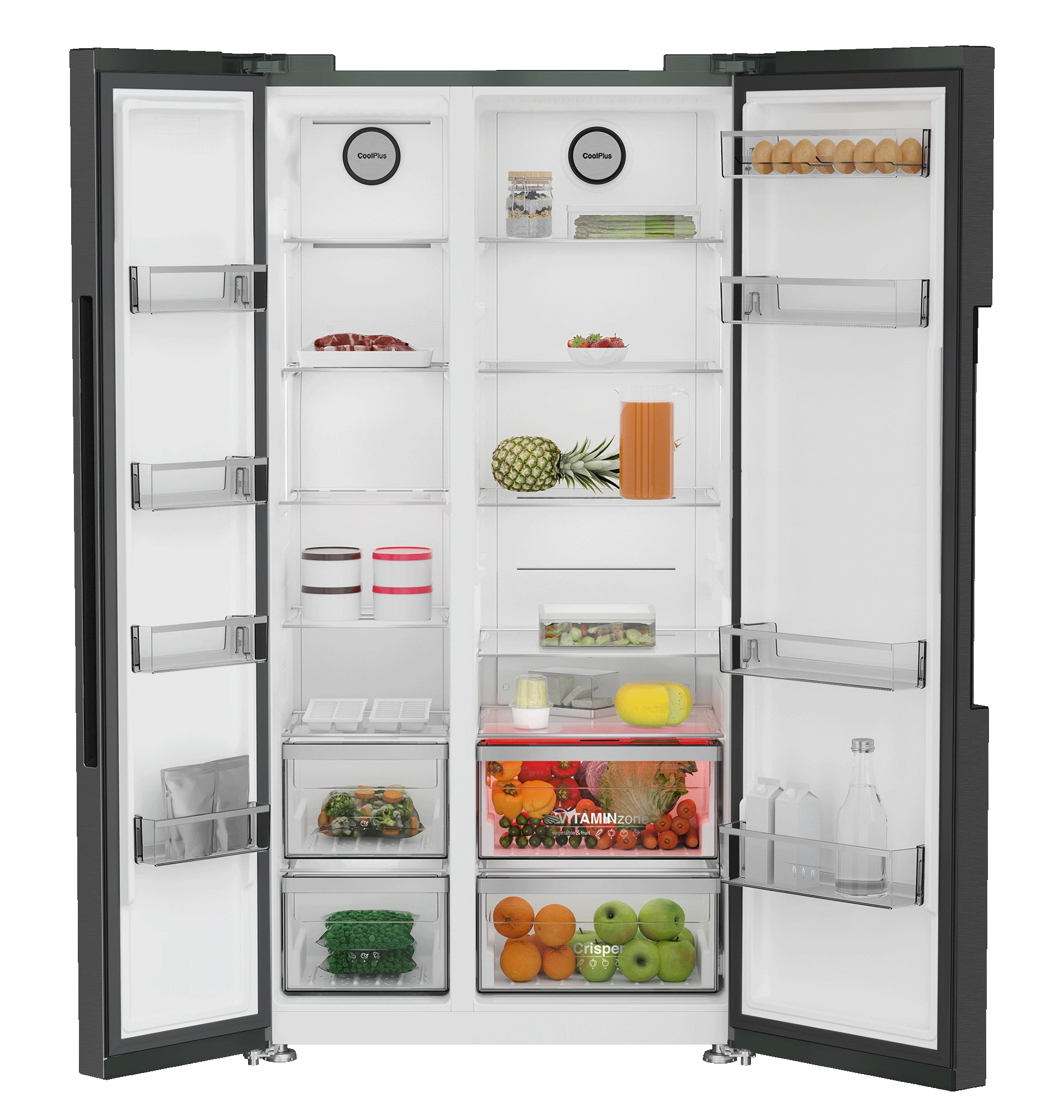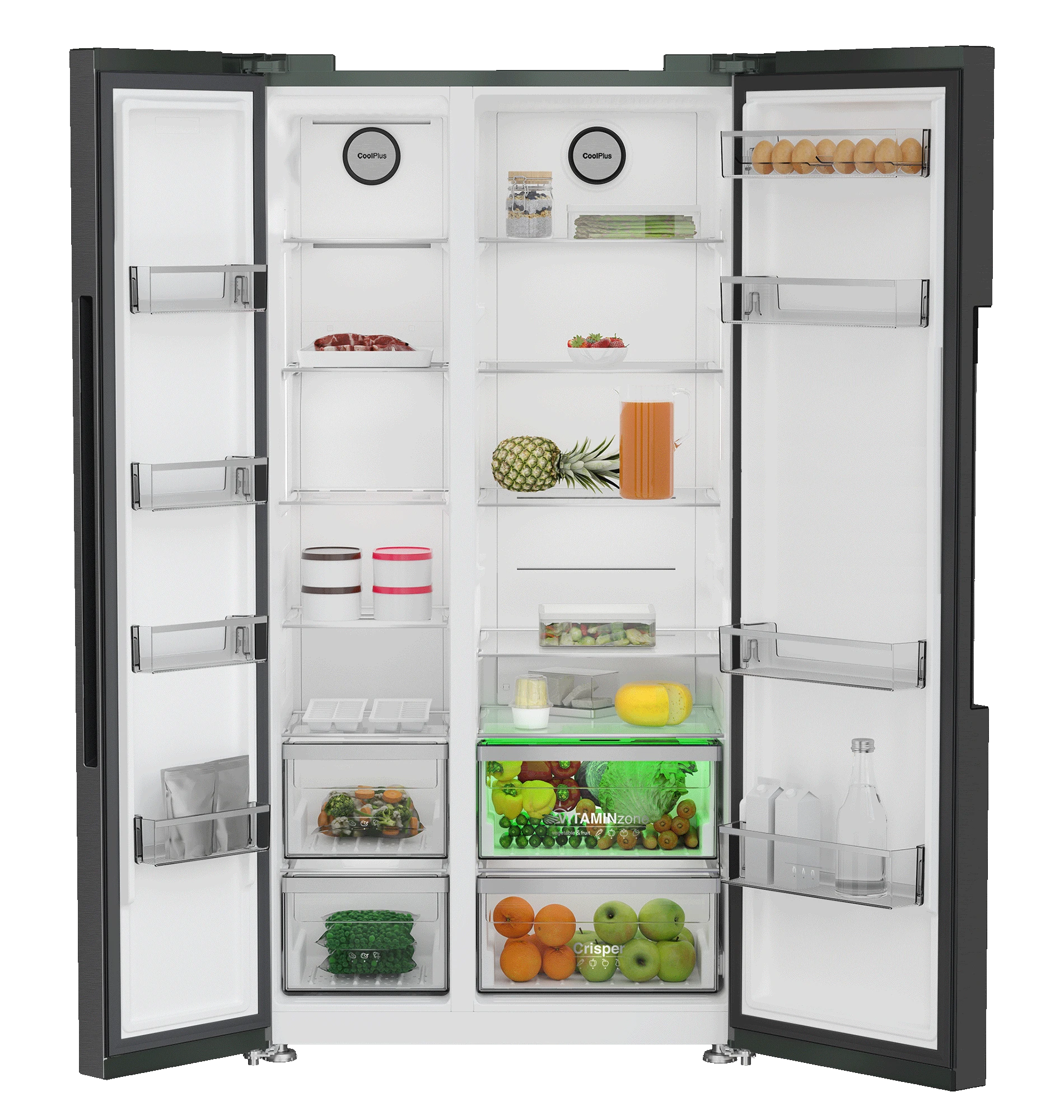Вместительный Side-by-Side холодильник цвета стальной антрацит с боковой морозильной камерой и ярким LED освещением. Сенсорная панель управления позволяет быстро установить нужный режим, не открывая холодильник. Благодаря системе охлаждения Duo-Cooling No Frost холодильник не нужно размораживать, а запахи между холодильной и морозильной камерами не смешиваются. Зона свежести FullFresh+ позволяет поддерживать стабильный уровень влажности внутри ящика для овощей и фруктов, благодаря чему продукты внутри остаются свежими до 30 суток. А инновационная технология трёх цветов VitaminZone имитирует природный цикл солнечного света, что позволяет сохранять все полезные вещества в овощах и фруктах.
