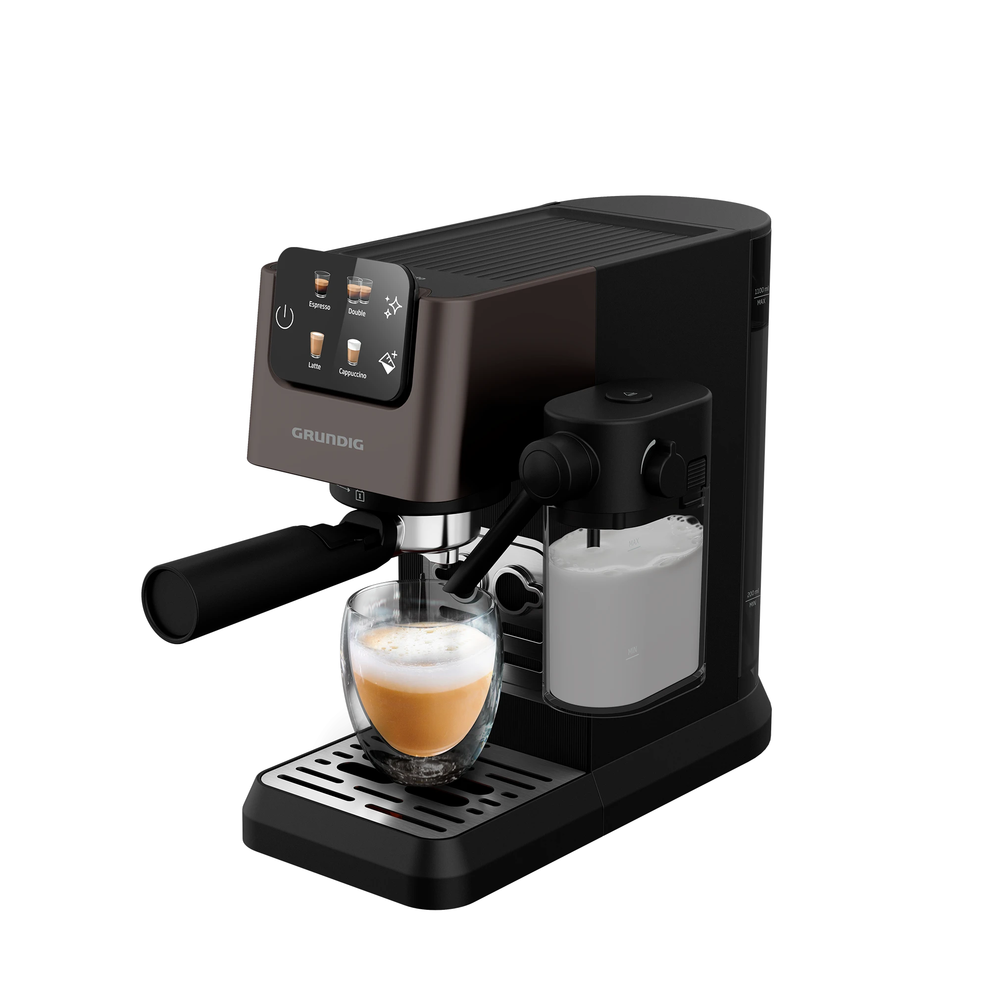 Рожковая кофеварка Grundig KSM 5330 — стильное и функциональное решение для ценителей ароматного кофе. Модель оснащена встроенным капучинатором с молочным стаканом объемом 0,3 литра, что позволяет с легкостью готовить эспрессо, латте или капучино, радуя себя и близких разнообразием напитков. В память устройства уже внесено четыре классических рецепта с оптимальным соотношением зерна, воды и молочной пенки - достаточно лишь заполнить рожок и выбрать нужную программу. Высокая мощность в 1600 Вт и давление помпы 15 бар обеспечивают быстрый процесс приготовления и насыщенный вкус кофе. Сенсорный дисплей делает управление интуитивно понятным, функция памяти сохраняет оптимальные для вас настройки пропорции, а регулировка высоты подставки под чашку позволит наслаждаться любыми порциями любимого напитка. Автоматическая очистка и система удаления накипи упрощают уход за техникой, продлевая срок службы. Функция подогрева чашек поддерживает оптимальную температуру для сохранения аромата кофе, а автоматическое отключение через 29 минут бездействия обеспечивает безопасность и экономию энергии.