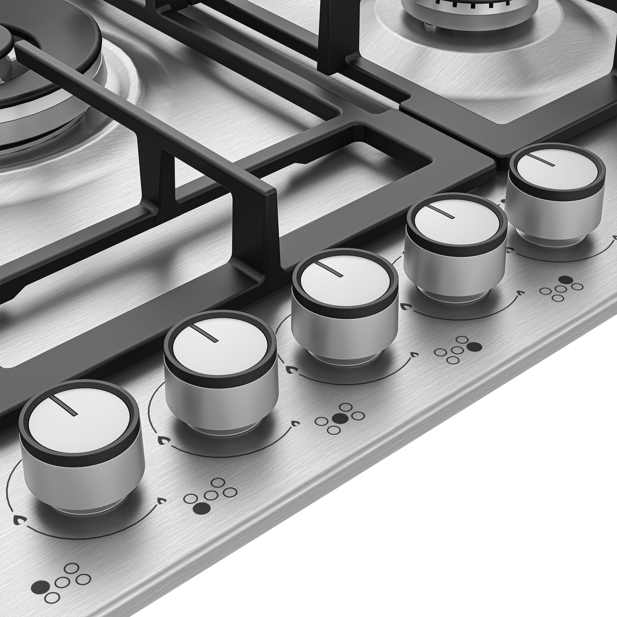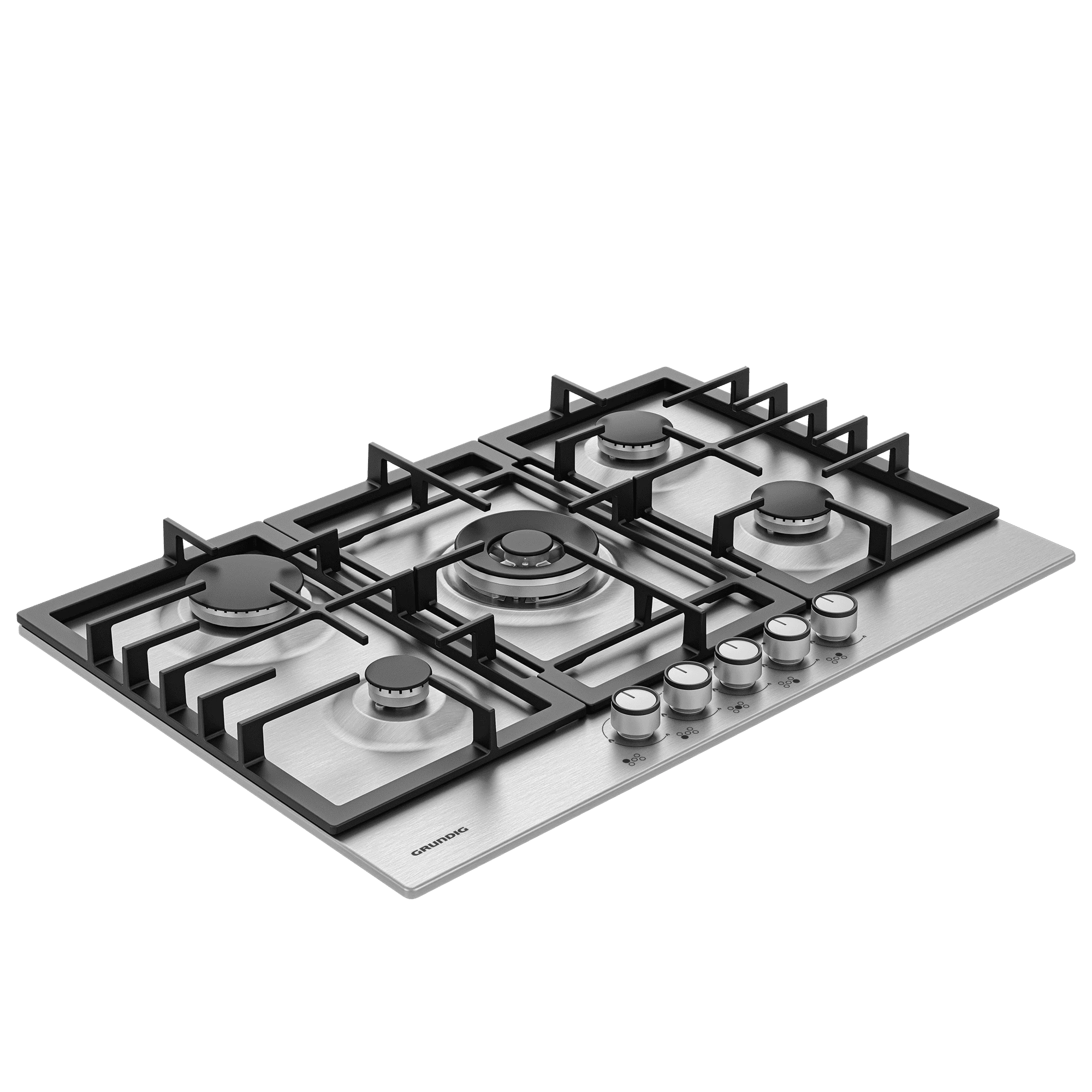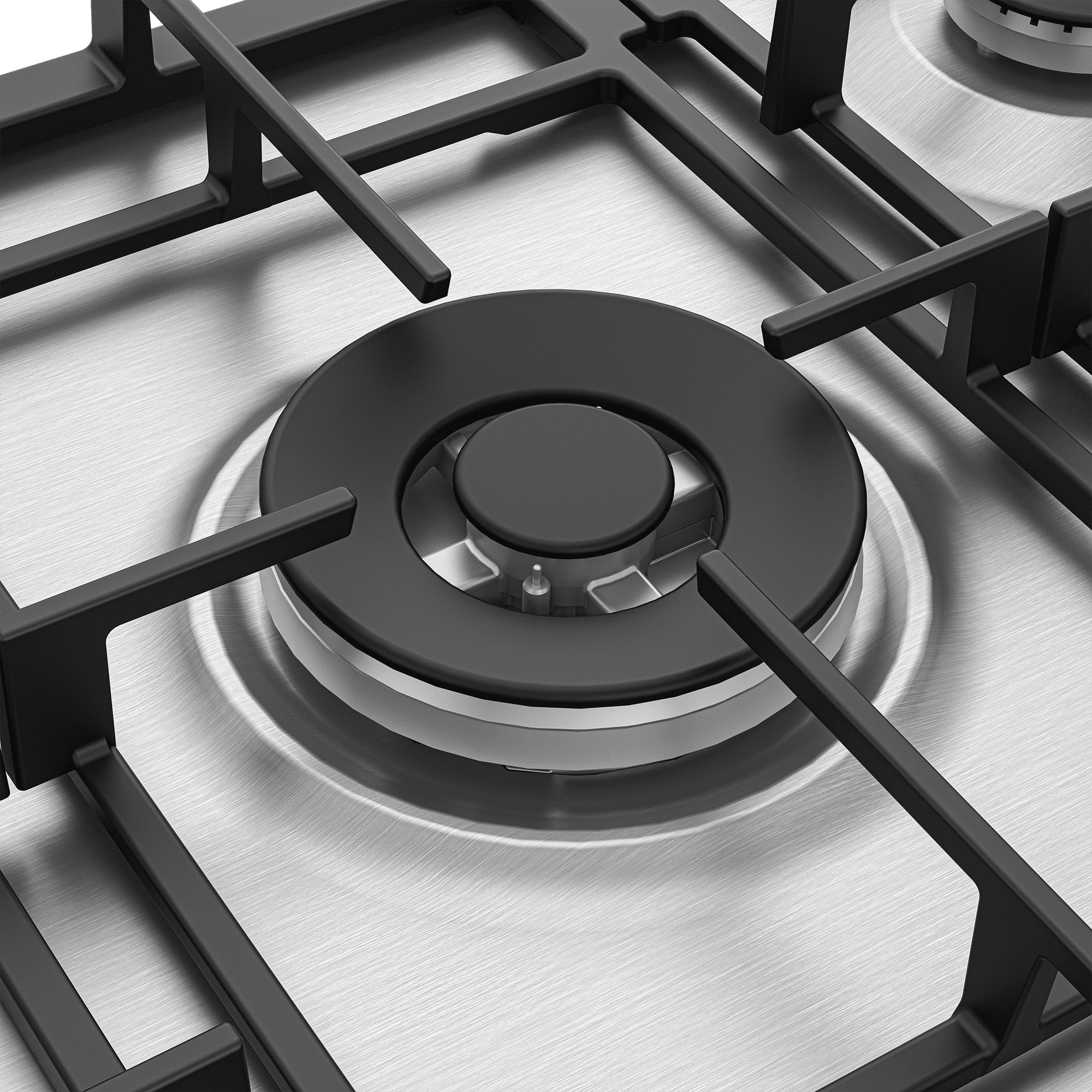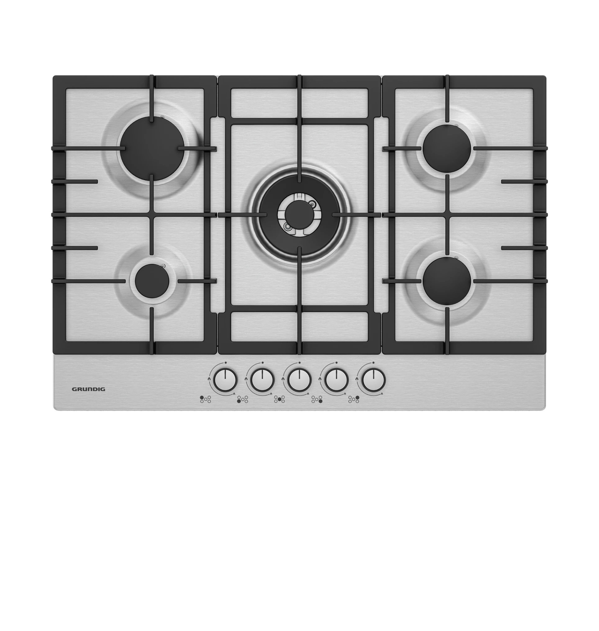 Встраиваемая газовая панель цвета нержавеющей стали с металлической поверхностью и 5 конфорками разной мощности для стандартной посуды и сковороды вок. Варочная панель шириной 75 см оснащена системой газ-контроля, которая прекращает подачу газа в конфорки, если пламя случайно гаснет. В ручки управления встроен автоматический электроподжиг конфорок для удобного использования газовой поверхности. Надежные чугунные решетки обеспечивают устойчивость посуды на варочной поверхности и легко снимаются для очистки после приготовления.