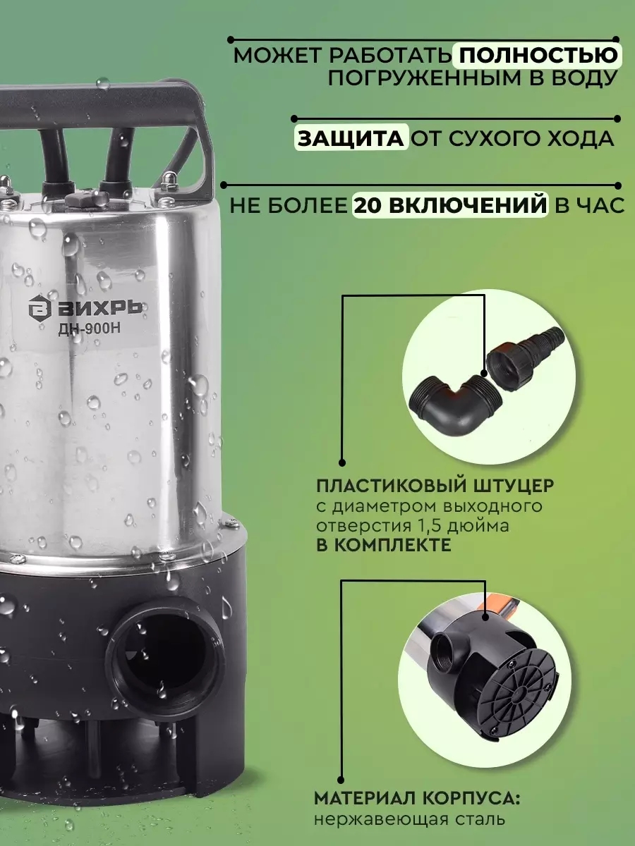 • Особенности Максимальный напор 9 м; есть поплавковый выключатель; корпус из нержавеющей стали; нижний тип забора воды
