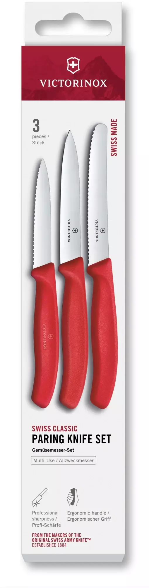 Состав комплектаВ комплекте 3 красных ножа: нож с сререйт заточкой, заостренным кончиком и длиной лезвия 8см, нож с прямой заточкой, заостренным кончиком и длиной лезвия 10см, нож с серрейт заточкой, закругленным кончиком и длиной лезвия 11 см