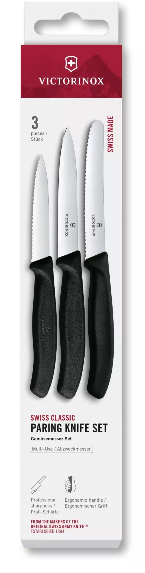 Состав комплектаВ комплекте 3 черных ножа: нож с сререйт заточкой, заостренным кончиком и длиной лезвия 8см, нож с прямой заточкой, заостренным кончиком и длиной лезвия 10см, нож с серрейт заточкой, закругленным кончиком и длиной лезвия 11 см