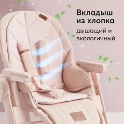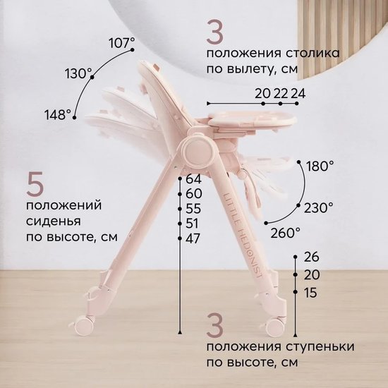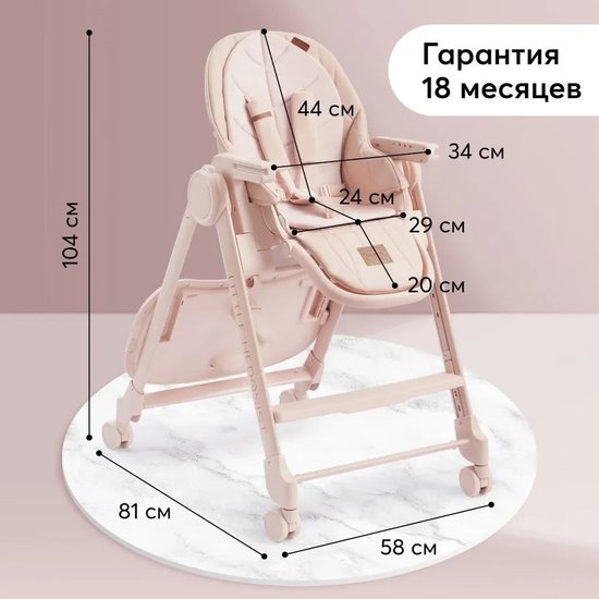 ✅Ключевые характеристикиВысокий стульчик для кормления предназначен для детей от 6 до 36 месяцев с максимальной нагрузкой до 25 кг. Вес изделия составляет 11 кг; размеры в разложенном виде 80х58х103 см. Сиденье шириной 29 см и глубиной 24 см оснащено пятиточечными ремнями безопасности с мягкими накладками. Стульчик выполнен из пластика и металла; а чехол из экокожи с мягкой хлопковой подкладкой обеспечивает комфорт малышу.✅Преимущества и отличияМодель оснащена регулируемой по высоте ступенькой; что позволяет детям постарше самостоятельно забираться в стульчик. Задние поворотные колёса со стопором обеспечивают мобильность и устойчивость; а передние колёса фиксированы для дополнительной безопасности. Спинка регулируется в трёх положениях (107°; что позволяет использовать стульчик в положении шезлонга.✅ПрактичностьСтульчик легко чистится благодаря материалам чехла и пластиковым деталям; которые можно протирать влажной тряпкой. Для удобства предусмотрен крючок для складывания подноса и регулируемая по высоте нижняя подножка с тремя положениями. Компактные размеры в сложенном виде (37х58х99 см) позволяют удобно хранить и транспортировать изделие.✅УникальностьЦельнолитая металлическая рама без острых углов выдерживает повышенную нагрузку и обеспечивает безопасность. Все четыре колеса стали поворотными; что улучшает маневренность. Сиденье из экокожи с мягкой хлопковой вкладкой и карман на обратной стороне спинки для хранения игрушек или средств гигиены делают модель удобной и функциональной.✅Ключевые характеристикиВысокий стульчик для кормления предназначен для детей от 6 до 36 месяцев с максимальной нагрузкой до 25 кг. Вес изделия составляет 11 кг; размеры в разложенном виде 80х58х103 см. Сиденье шириной 29 см и глубиной 24 см оснащено пятиточечными ремнями безопасности с мягкими накладками. Стульчик выполнен из пластика и металла; а чехол из экокожи с мягкой хлопковой подкладкой обеспечивает комфорт малышу.✅Преимущества и отличияМодель оснащена регулируемой по высоте ступенькой; что позволяет детям постарше самостоятельно забираться в стульчик. Задние поворотные колёса со стопором обеспечивают мобильность и устойчивость; а передние колёса фиксированы для дополнительной безопасности. Спинка регулируется в трёх положениях (107°; что позволяет использовать стульчик в положении шезлонга.✅ПрактичностьСтульчик легко чистится благодаря материалам чехла и пластиковым деталям; которые можно протирать влажной тряпкой. Для удобства предусмотрен крючок для складывания подноса и регулируемая по высоте нижняя подножка с тремя положениями. Компактные размеры в сложенном виде (37х58х99 см) позволяют удобно хранить и транспортировать изделие.✅УникальностьЦельнолитая металлическая рама без острых углов выдерживает повышенную нагрузку и обеспечивает безопасность. Все четыре колеса стали поворотными; что улучшает маневренность. Сиденье из экокожи с мягкой хлопковой вкладкой и карман на обратной стороне спинки для хранения игрушек или средств гигиены делают модель удобной и функциональной.