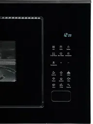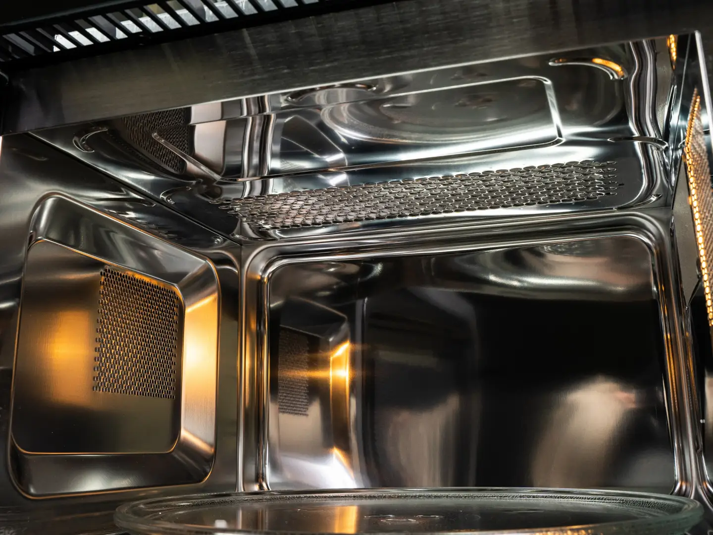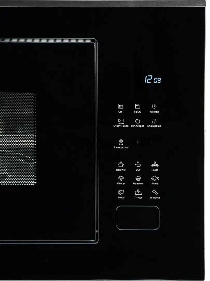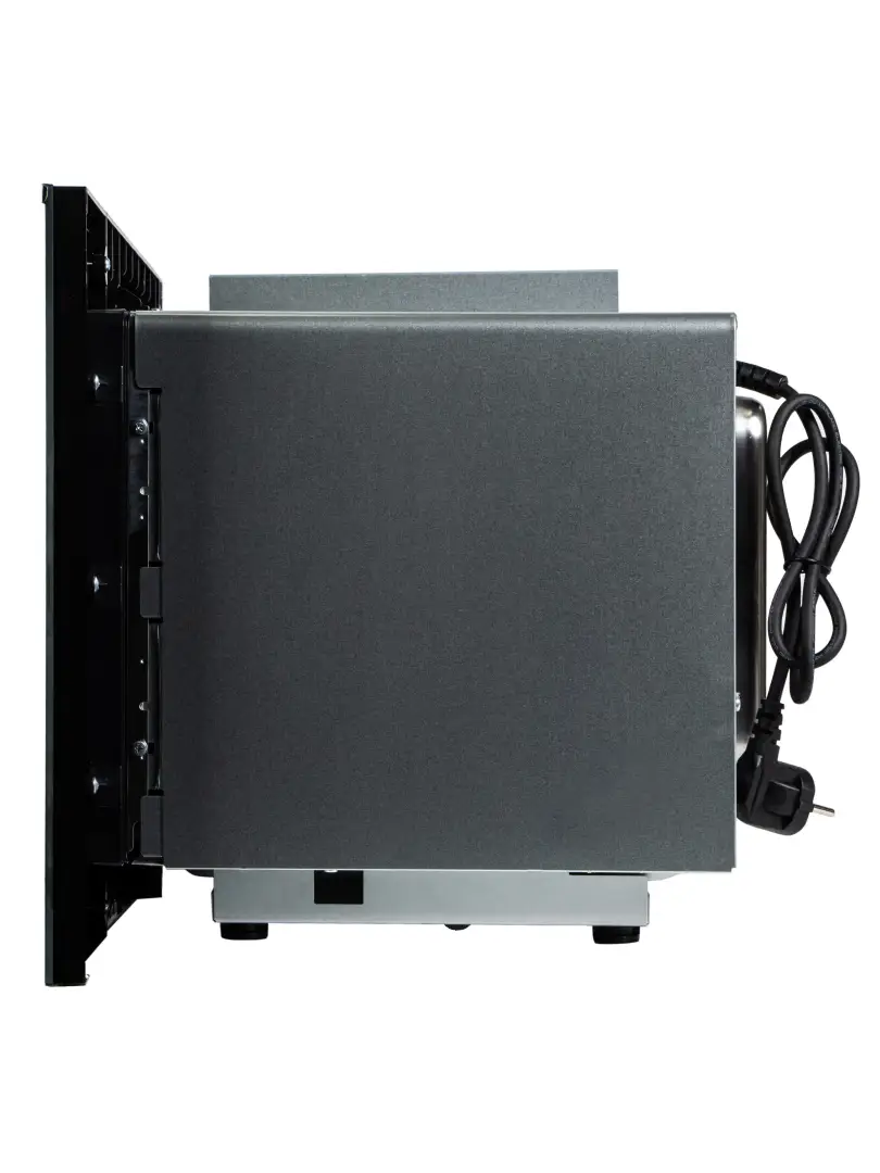 Встраиваемая микроволновая печь с элегантной вставкой из нержавеющей стали сочетает в себе функциональность и лаконичный дизайн без выступающих элементов, что позволяет установить ее в любую современную кухню.