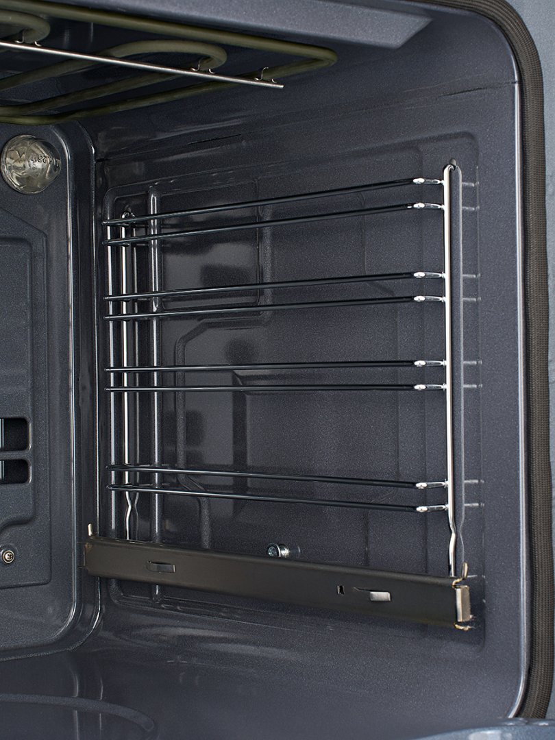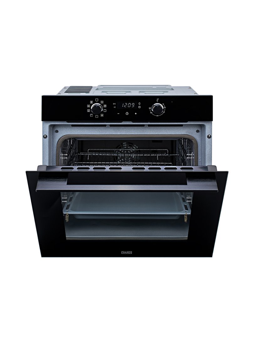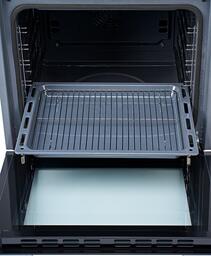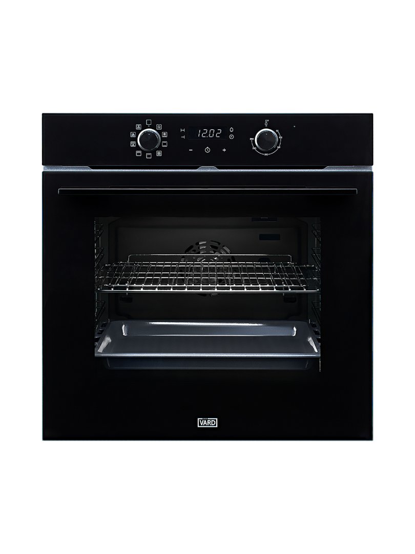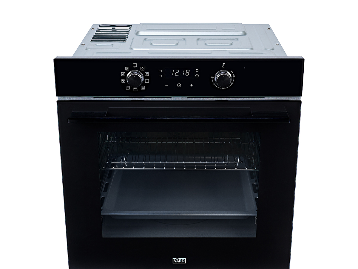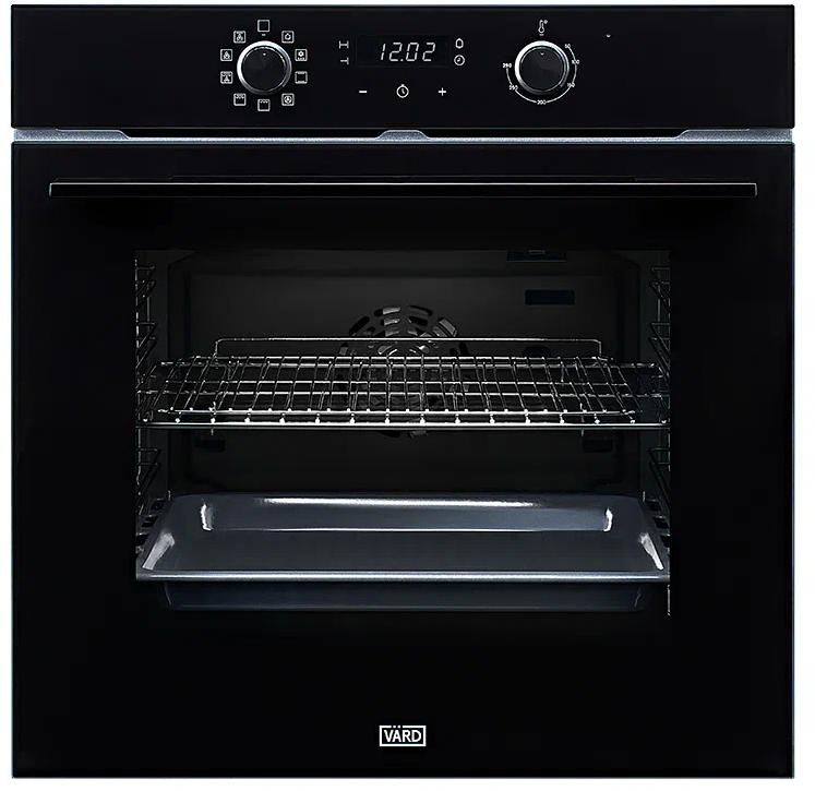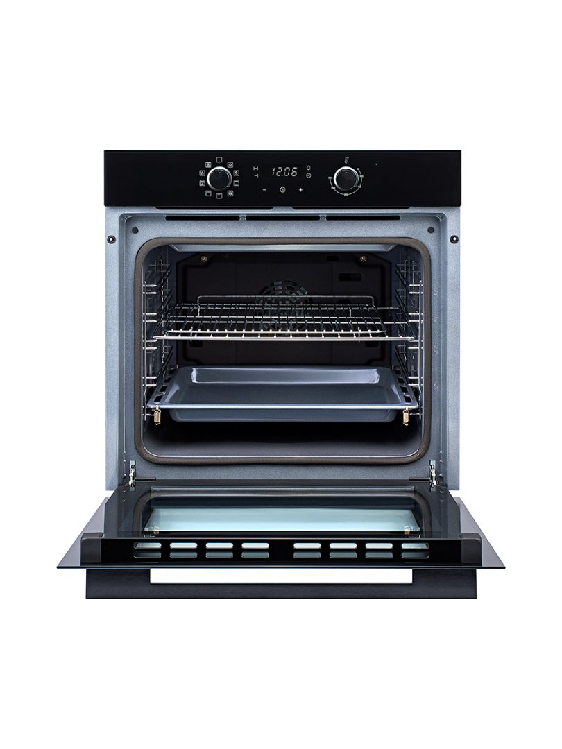 Черный встраиваемый духовой шкаф для соременной кухни. Каталитическая очистка избавит от утомительного ухода за прибором, телескопические направляющие обеспечат удобство взаиможействия с блюдом, а нагрев 290 градусов позволит готовить пиццу как в печи