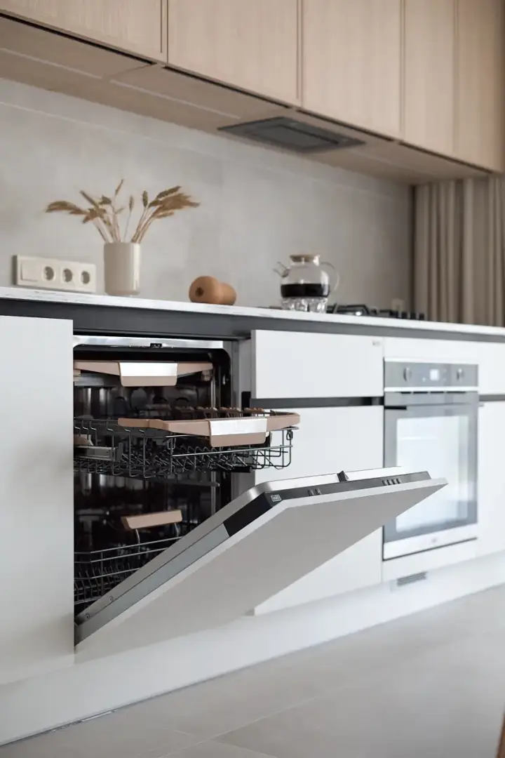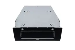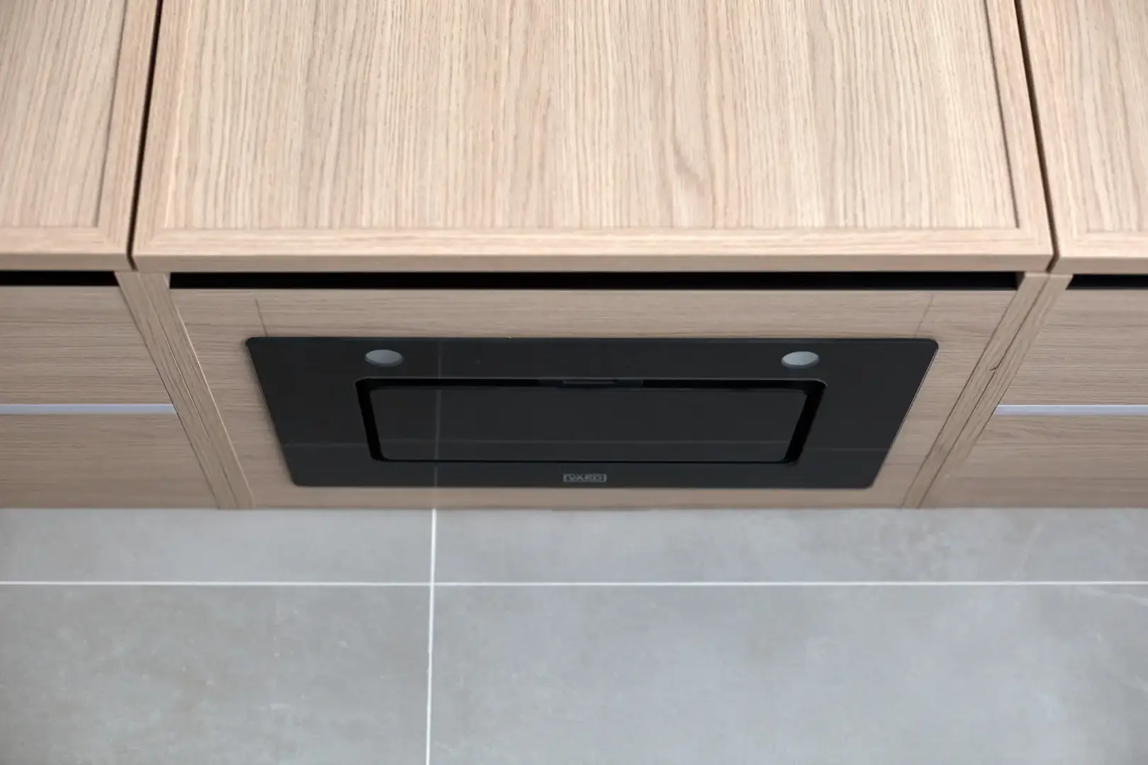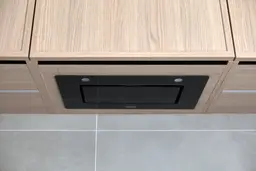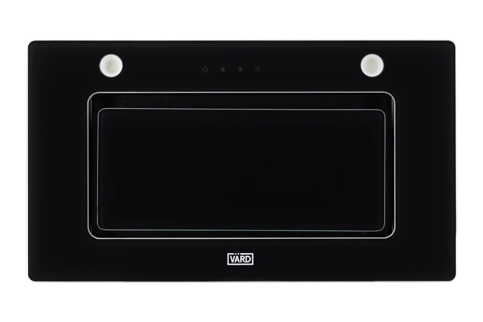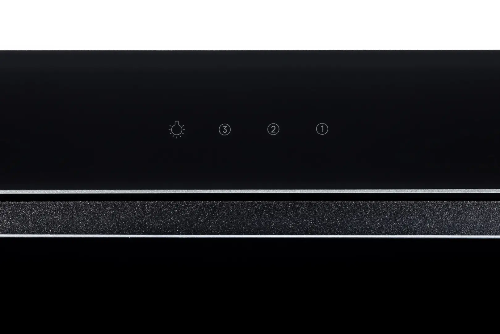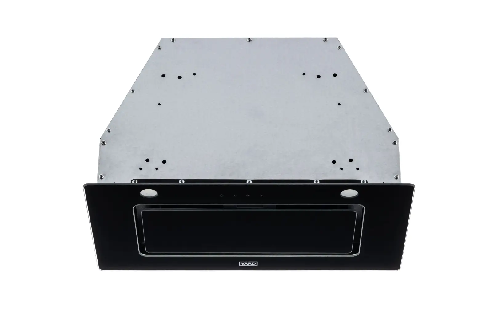 Полностью встраиваемая вытяжка черного цвета обладает минималистичным дизайном и высокой производительностью, что дает возможность установить ее в современные кухни большой площади.