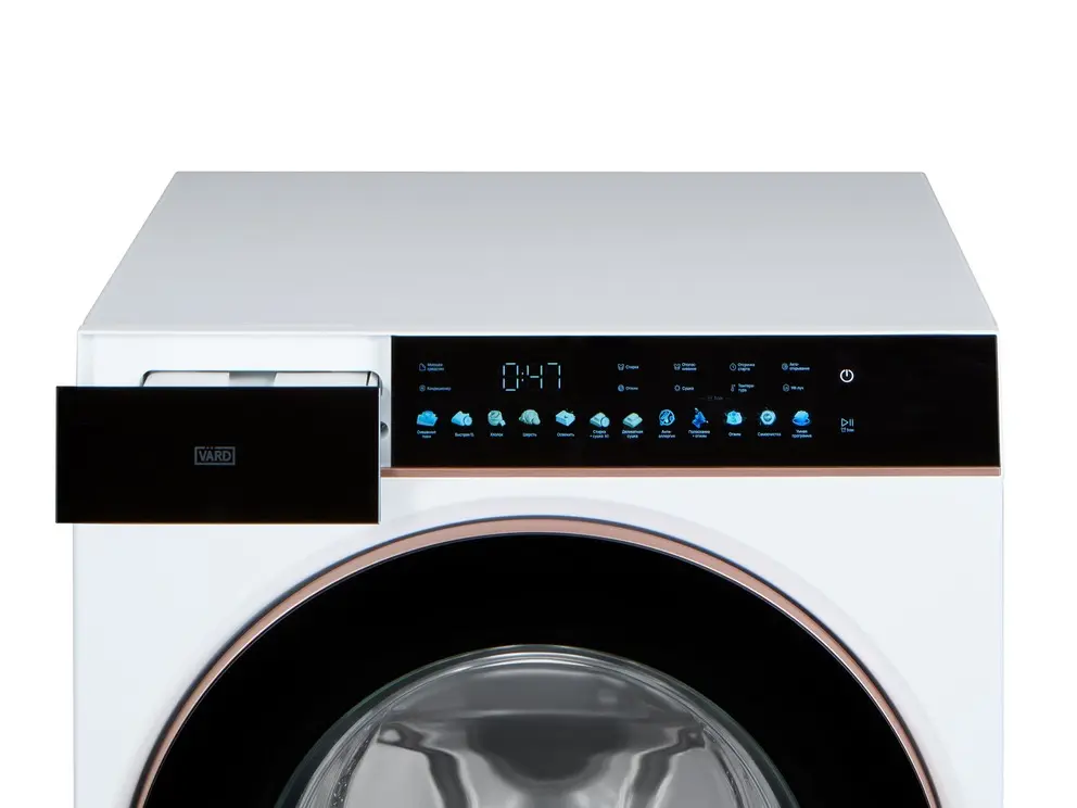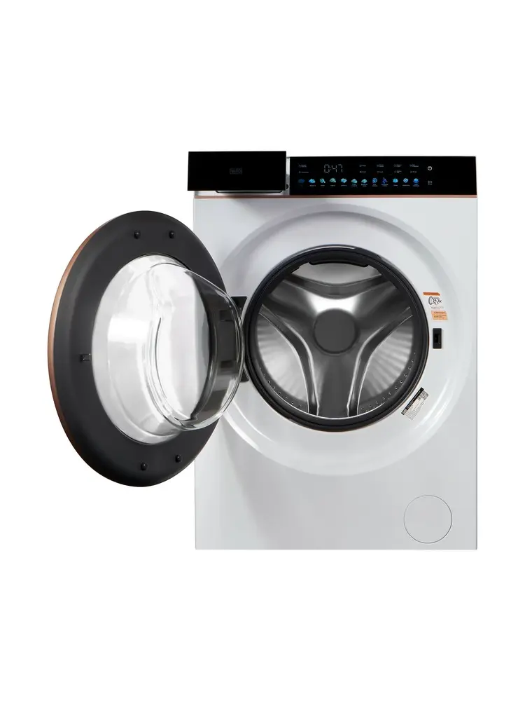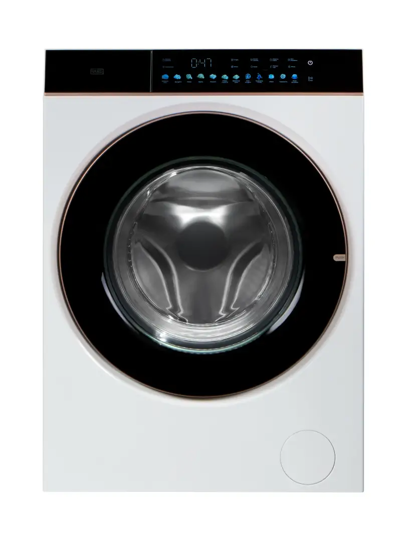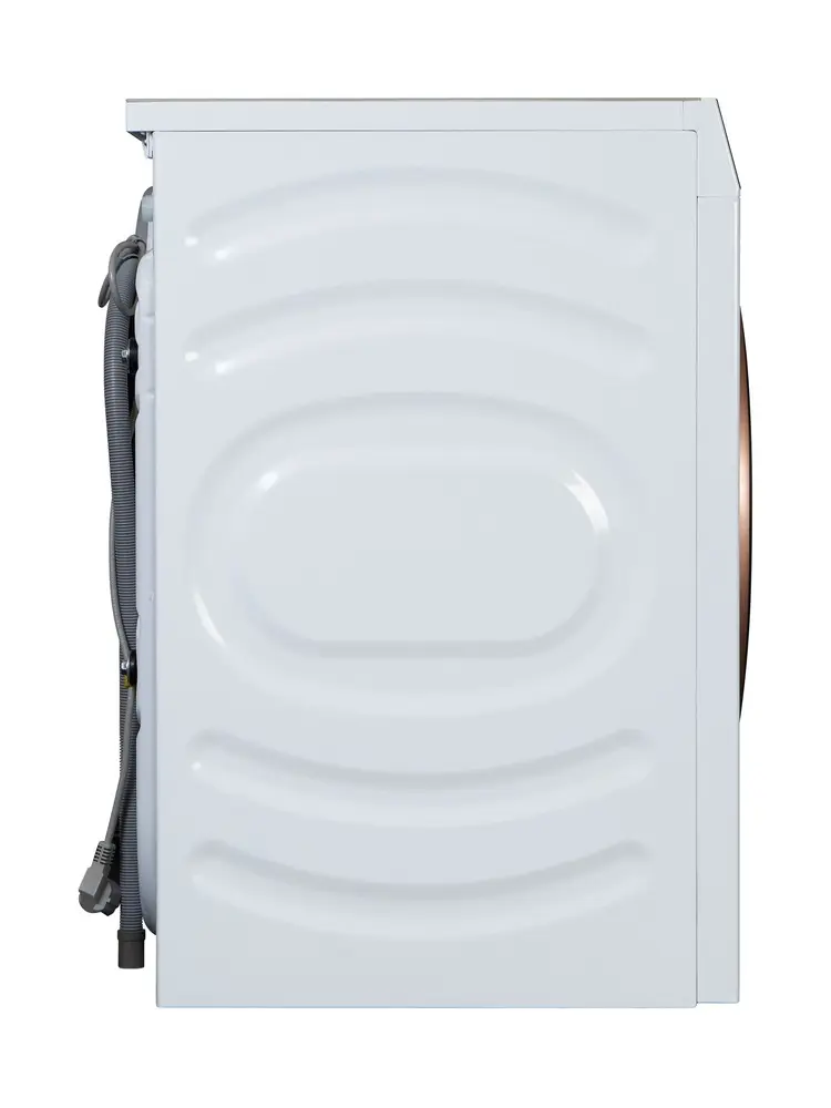 Стирально-сушильная машина белого цвета со вставками цвета розового золота сочетает в себе премиальный дизайн и передовые технологии.