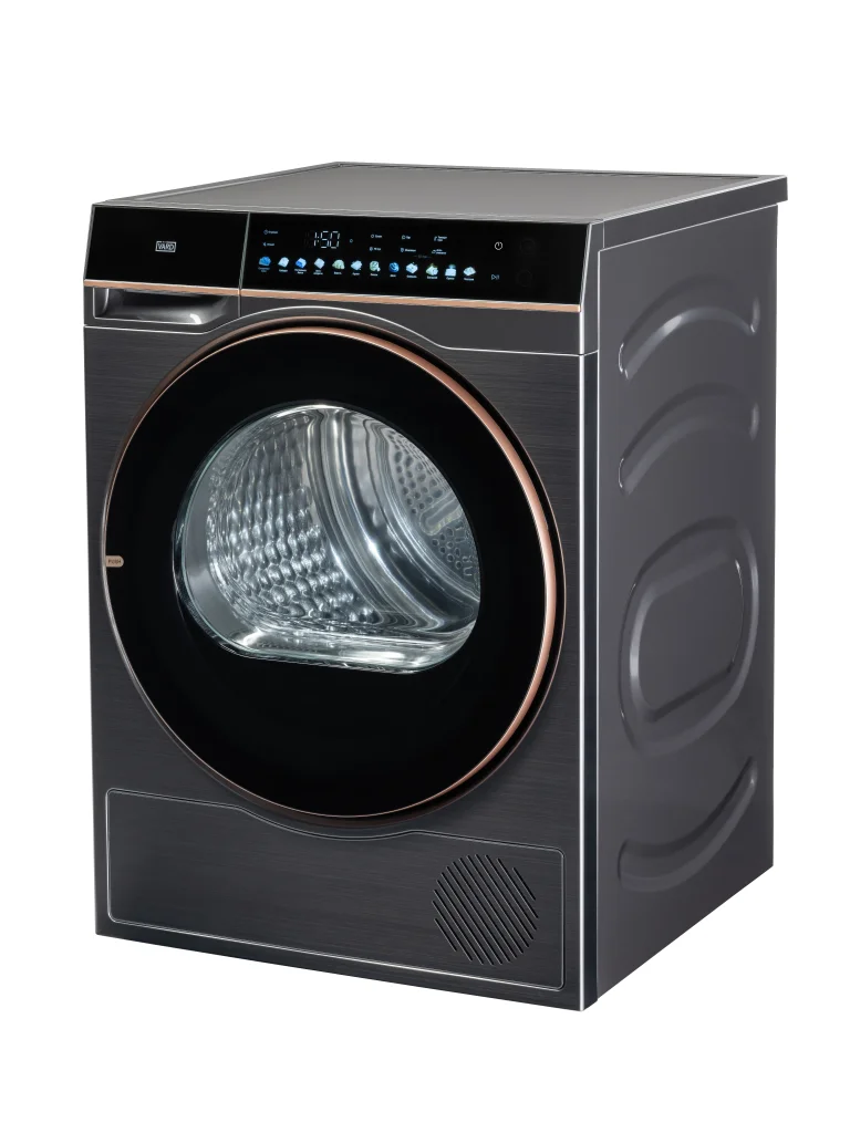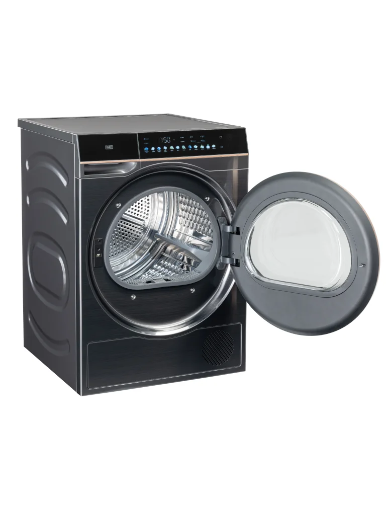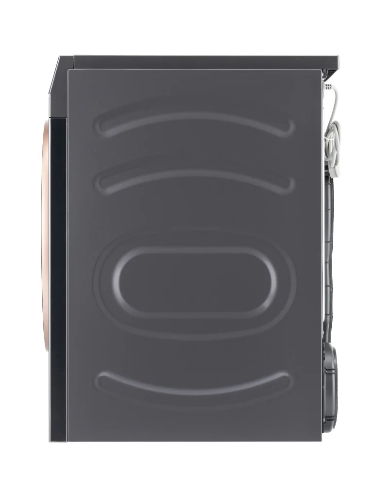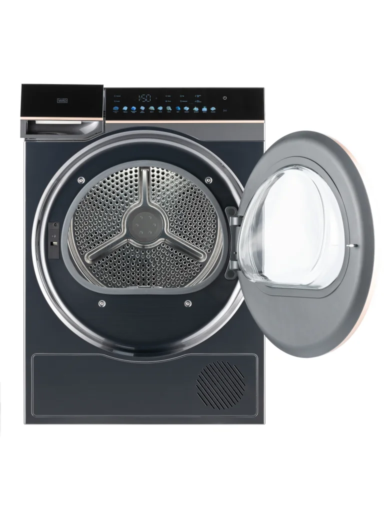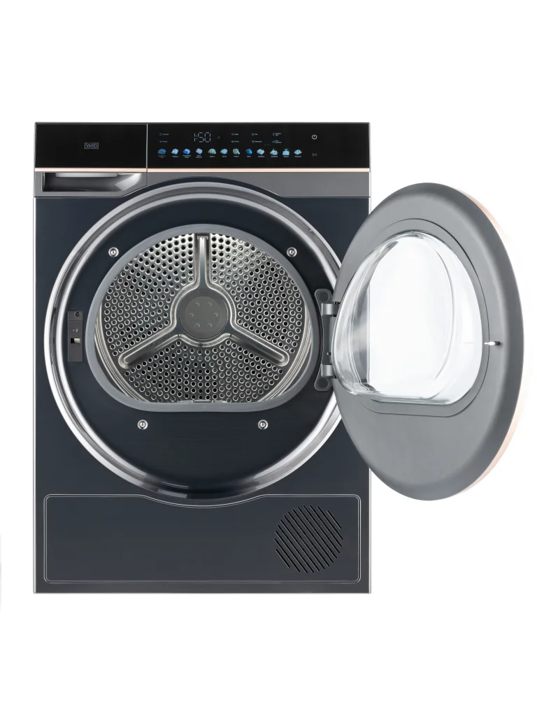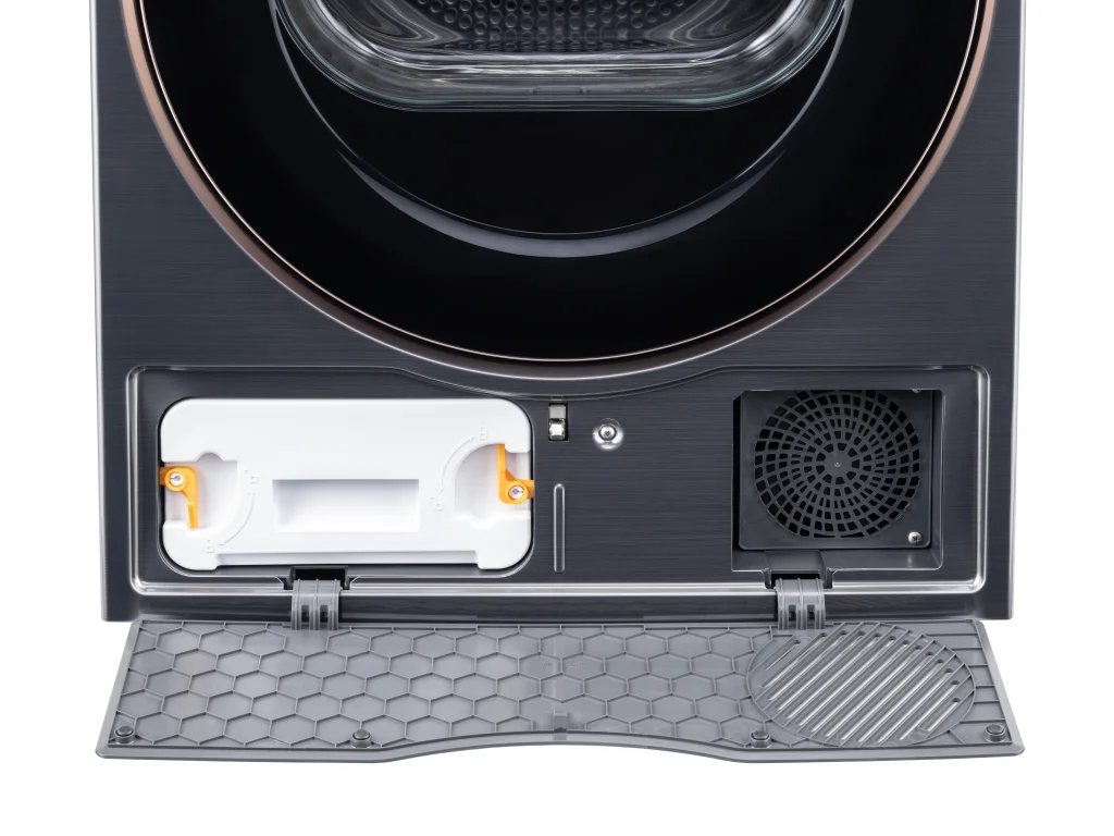 Сушильная машина серого цвета с эксклюзивной медной отделкой, максимальной загрузкой 10 кг и технологией сушки Heat pump сочетает в себе лаконичный дизайн и передовые технологии.