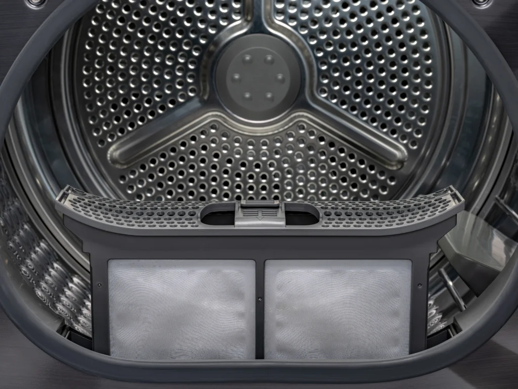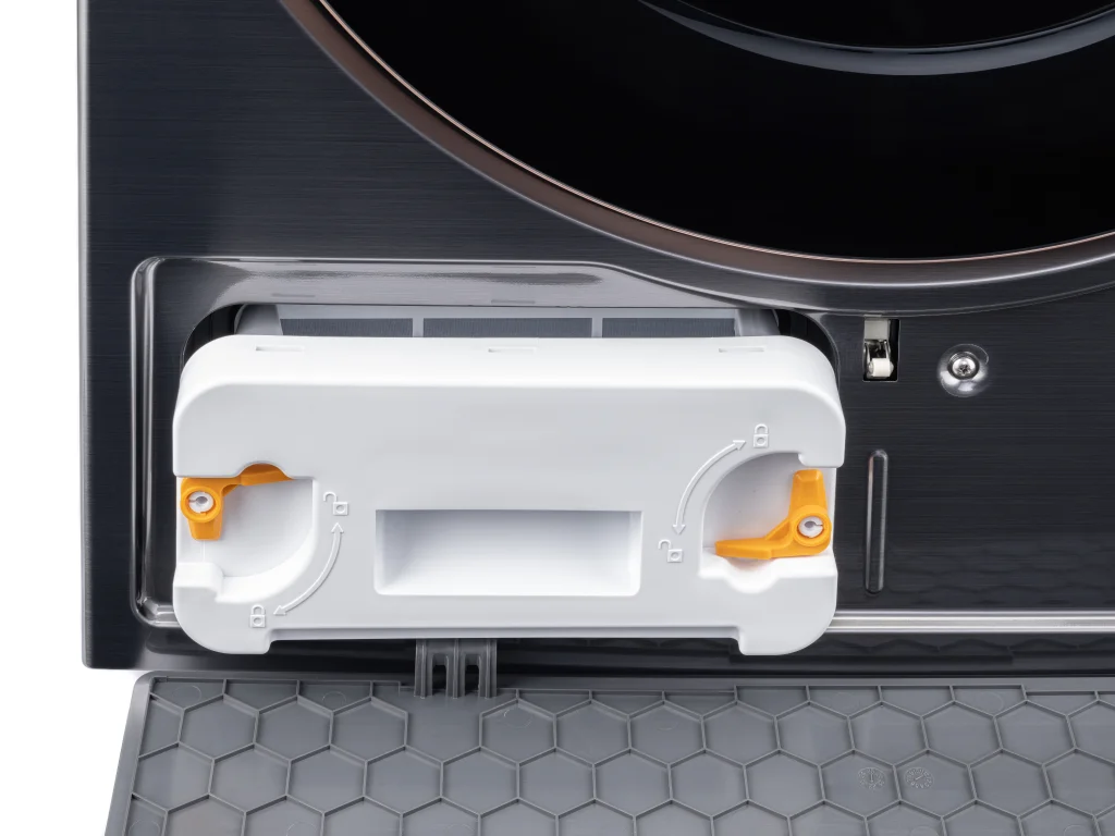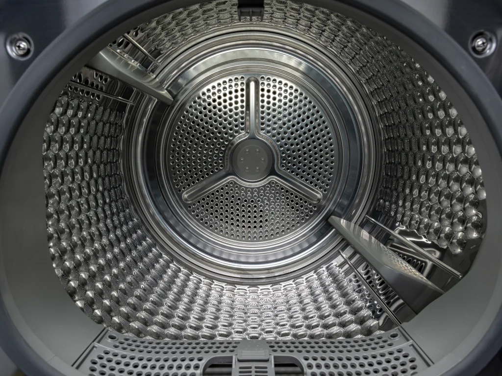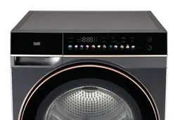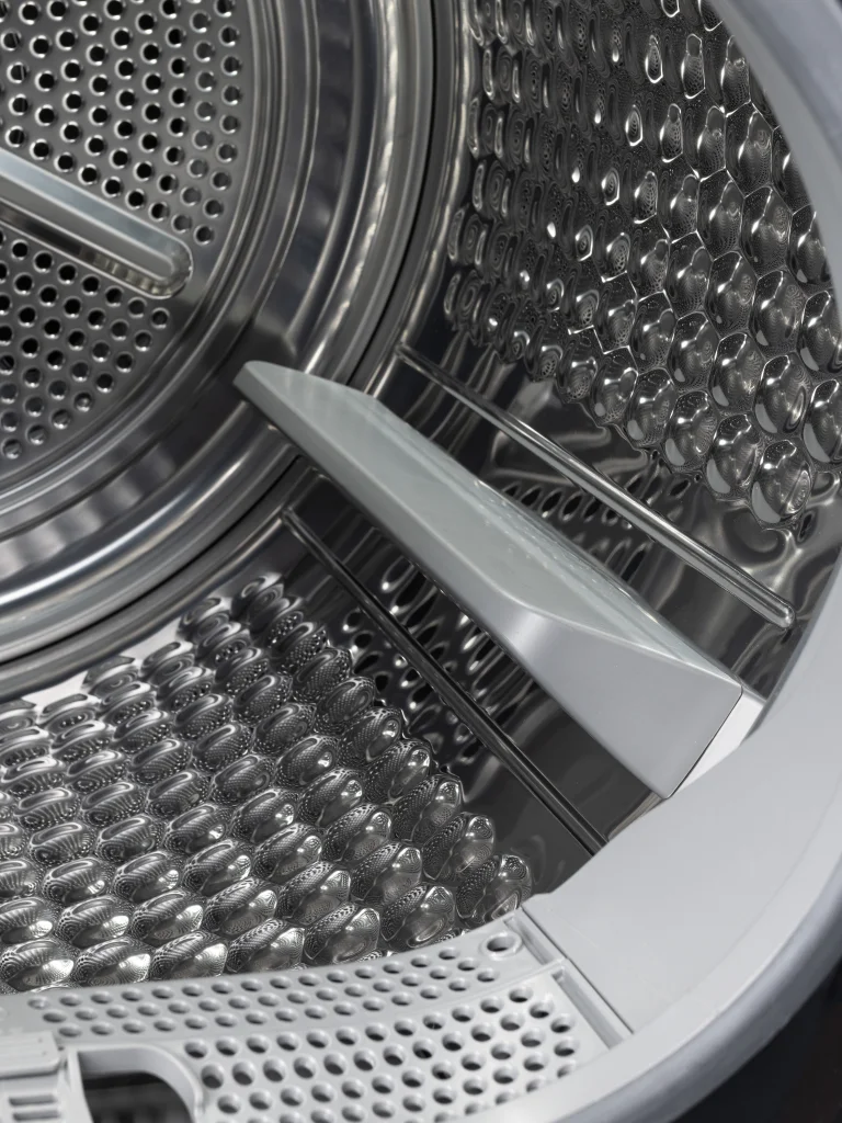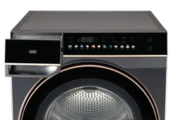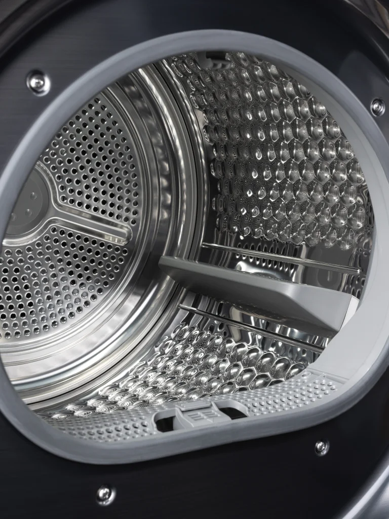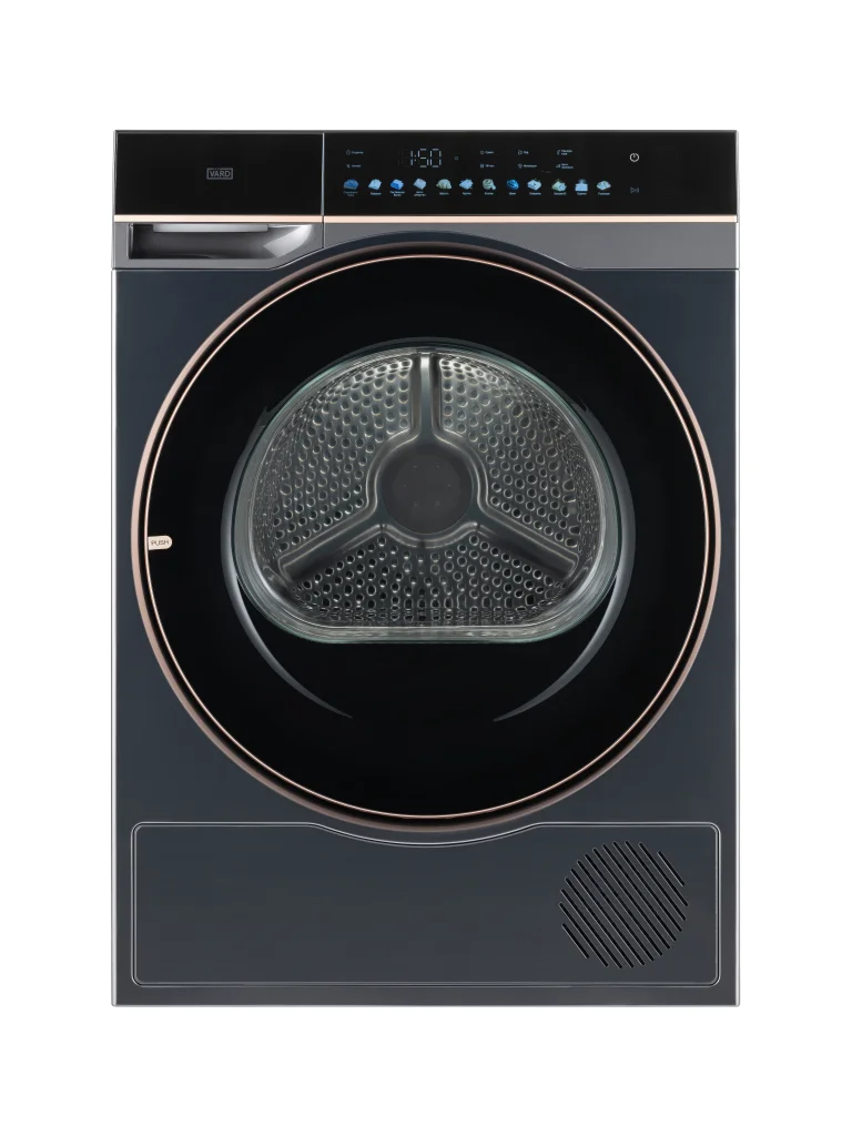 Сушильная машина серого цвета с эксклюзивной медной отделкой, максимальной загрузкой 10 кг и технологией сушки Heat pump сочетает в себе лаконичный дизайн и передовые технологии.