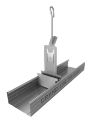 его конструкция позволяет изменять высоту установки профилей, что удобно при монтаже каркаса и помогает выровнять его даже при значительных неровностях перекрытия