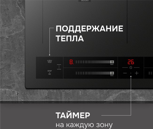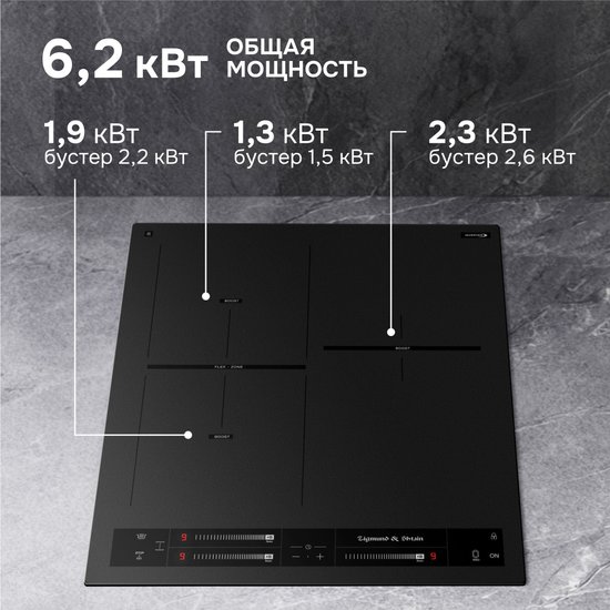 Подробная информация о конфоркахБлижняя левая 180 мм, 1900/2200Дальняя левая 180 мм, 1300/1500Левая Flex-зона 180*380 мм, 3000/3600Дальняя правая 180 мм, 2300/2600