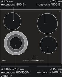 Подробная информация о конфоркахБлижняя левая:120 мм/0.7 кВт; 175 мм/1.5 кВт; 230 мм/2.3 кВт (тройная зона расширения). Ближняя правая:165 мм/1.2 кВт. Дальняя левая:165 мм/1.2 кВт. Дальняя правая:200 мм/1.8 кВт
