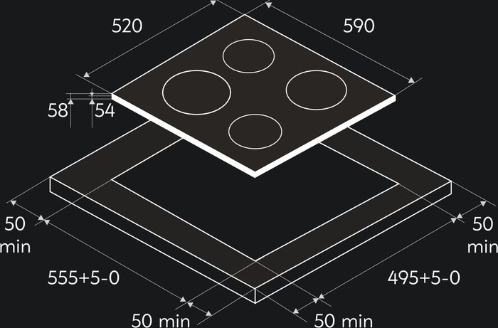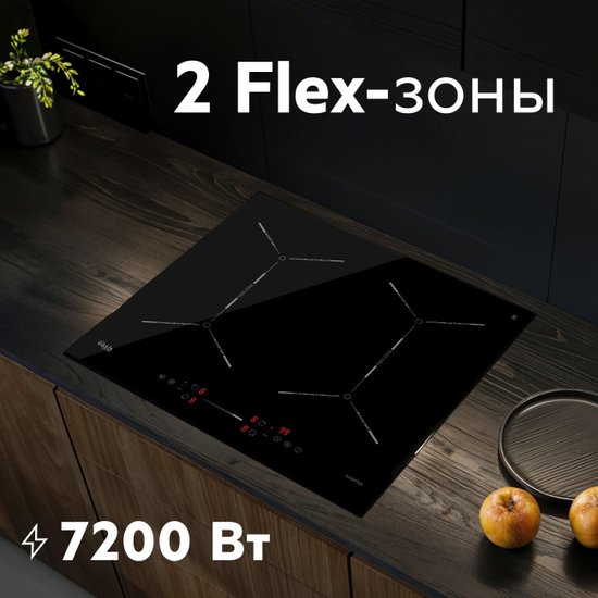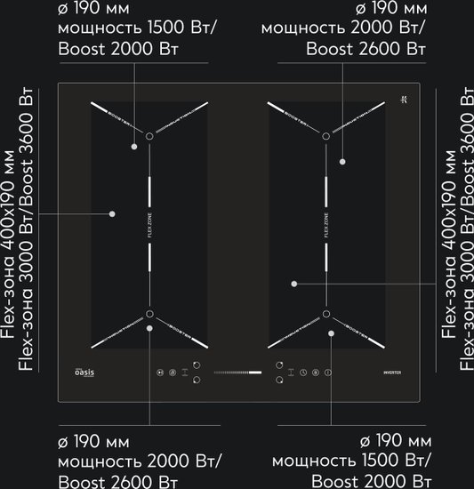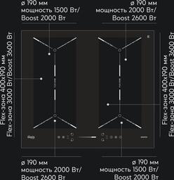 Подробная информация о конфоркахБлижняя левая конфорка – диаметр 190 мм, мощность 2,0 кВт (booster 2,6 кВт). Ближняя правая конфорка – диаметр 190 мм, мощность 1,5 кВт (booster 2,0 кВт). Дальняя левая конфорка – диаметр 190 мм, мощность 1,5 кВт (booster 2,0 кВт). Дальняя правая конфорка – диаметр 190 мм, мощность 2,0 кВт (booster 2,6 кВт). Flex zone R1+R2 – 190×400 мм, мощность 3,0 кВт (booster 3,6 кВт). Flex zone R3+R4 – 190×400 мм, мощность 3,0 кВт (booster 3,6 кВт).
