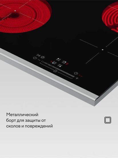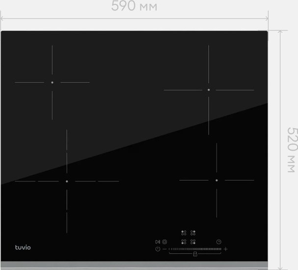 Tuvio HRS82LBB1 — это встраиваемая электрическая варочная панель общей мощностью 6400 Вт. Вместительная и универсальная — 59 см в ширину — легко вписывается в любую кухню. Современная технология быстрого нагрева Hi-Light взаимодействует с любой посудой: поверхность чувствительна даже к небольшому диаметру дна.Панель сделана из стеклокерамики. Такое покрытие выдерживает высокие температуры, за ним просто ухаживать мягкими неабразивными средствами.Сенсорный слайдер отвечает за простое управление: достаточно провести пальцем, чтобы установить температуру или другие параметры конфорок. Даже максимальные значения можно настроить одним касанием. Отслеживать время удобно на встроенном таймере.Рабочая поверхность подходит для самых разных задач. Специальное двойное расширение контура конфорки помогает увеличивать зону нагрева. Функция пригодится и для больших круглых блюд, и для грилевых сковород. Широкие закруглённые металлические рамки по двум сторонам панели защищают её от сколов и повреждений.Варочная панель поддерживает функцию защитного отключения: поверхность отключается частично или полностью, если долго не используется. Для дополнительной безопасности есть блокировка от детей, чтобы малыш случайно не включил нагрев и не обжёгся.Tuvio HRS82LBB1 — это встраиваемая электрическая варочная панель общей мощностью 6400 Вт. Вместительная и универсальная — 59 см в ширину — легко вписывается в любую кухню. Современная технология быстрого нагрева Hi-Light взаимодействует с любой посудой: поверхность чувствительна даже к небольшому диаметру дна.Панель сделана из стеклокерамики. Такое покрытие выдерживает высокие температуры, за ним просто ухаживать мягкими неабразивными средствами.Сенсорный слайдер отвечает за простое управление: достаточно провести пальцем, чтобы установить температуру или другие параметры конфорок. Даже максимальные значения можно настроить одним касанием. Отслеживать время удобно на встроенном таймере.Рабочая поверхность подходит для самых разных задач. Специальное двойное расширение контура конфорки помогает увеличивать зону нагрева. Функция пригодится и для больших круглых блюд, и для грилевых сковород. Широкие закруглённые металлические рамки по двум сторонам панели защищают её от сколов и повреждений.Варочная панель поддерживает функцию защитного отключения: поверхность отключается частично или полностью, если долго не используется. Для дополнительной безопасности есть блокировка от детей, чтобы малыш случайно не включил нагрев и не обжёгся.
