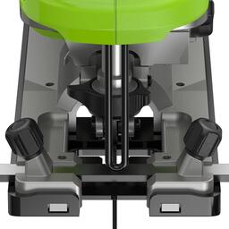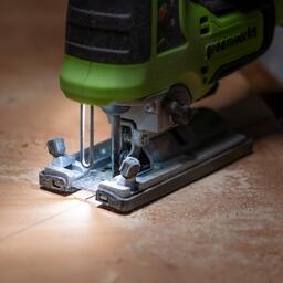 Для надежности подошва лобзика литая, сделана из металла и прикрыта пластиковым кожухом. Пластиковый кожух легко снимается для замены в случае истирания или повреждения. Маятник имеет 4 ступени регулировки хода с плавной регулировкой скорости, обеспечивая эффективную и точную работу инструментом. Двигатель оснащен магнитным тормозом, который останавливает режущее полотно моментально, что позволят останавливать лобзик в резе. Предназначение устройства - пиление древесины и металла. Полотно имеет быстро зажимной бесключевой фиксатор для легкой и быстрой замены полотен. Данная модель работает от аккумулятора 24V, который мощнее стандартного аккумулятора 18V на 30%. К тому же, применяемый аккумулятор совместим с более чем 70-ю устройствами из серии Greenworks G-24V. Регулировка скорости пиления - плавная, в диапазоне до 3000 ходов в минуту. Для защиты от порезов предусмотрен предохранитель. Для комфортной работы в плохо освещенных местах есть LED подсветка рабочей зоны. Рукоятка имеет удобную форму и прорезинена. Устройство оснащается системой защиты от случайного включения. Приятным дополнением является дополнительные полотна в количестве 2-х штук (в комплекте). Регулируемый угол наклона подошвы: до 45-град в обе стороны. Для регулировки наклона не нужно использовать дополнительный инструмент, фиксатор оснащен эксцентриковым механизмом. Возможность подключения пылесоса.