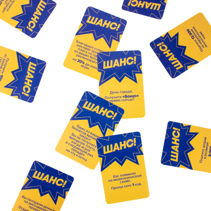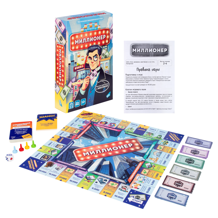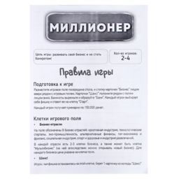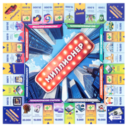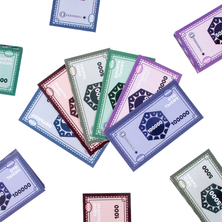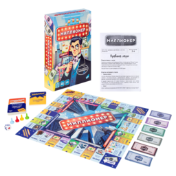 В наборе: игровое поле - 1шт, игровые карточки - 30шт, игровые денежные купоны - 72шт, фишки - 4шт, кубик - 1шт, правила игры - 1шт.