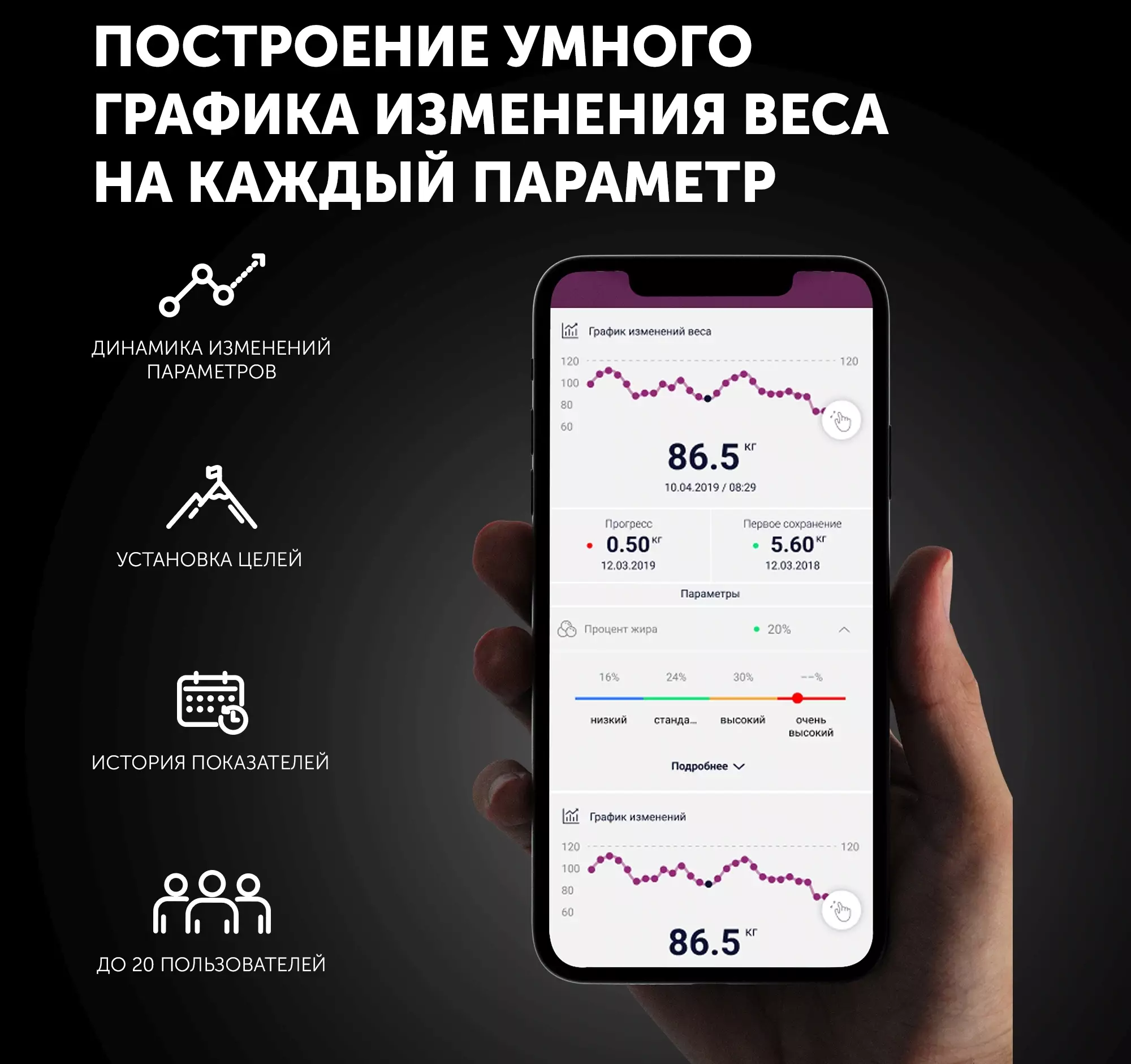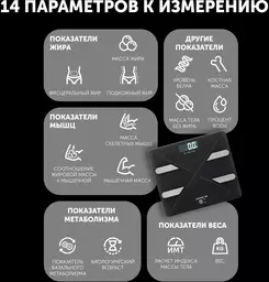 • Дополнительные измерения параметров тела возраст тела, определение доли белков, определение доли воды, определение доли жировой ткани, расчет ИМТ