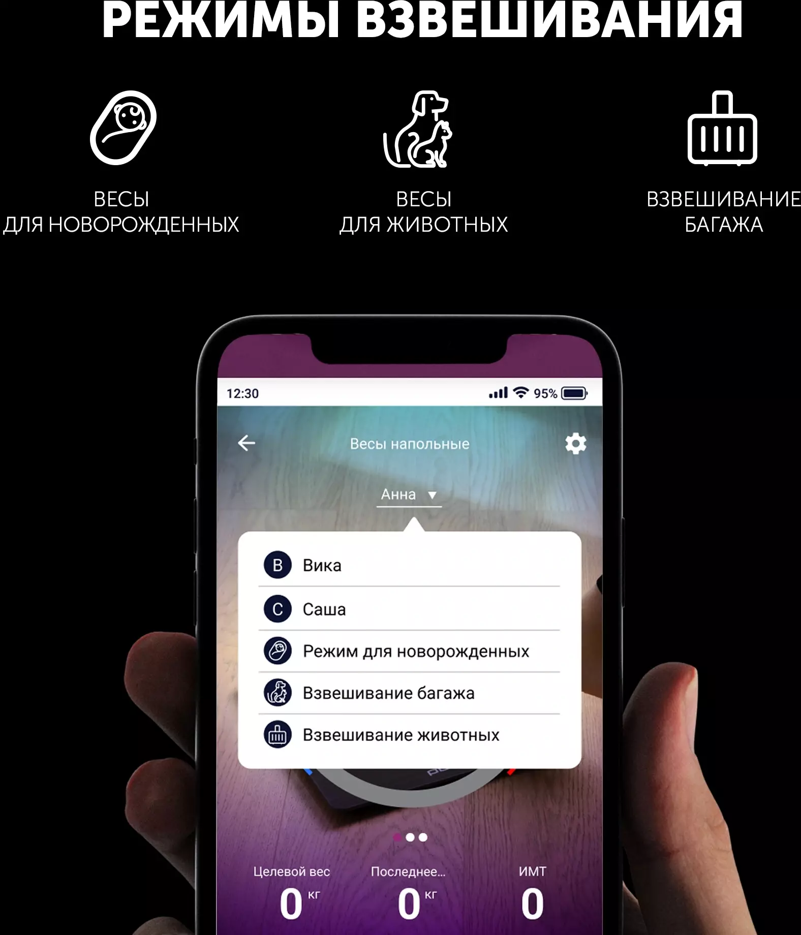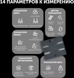• Дополнительные измерения параметров тела возраст тела, определение доли белков, определение доли воды, определение доли жировой ткани, расчет ИМТ