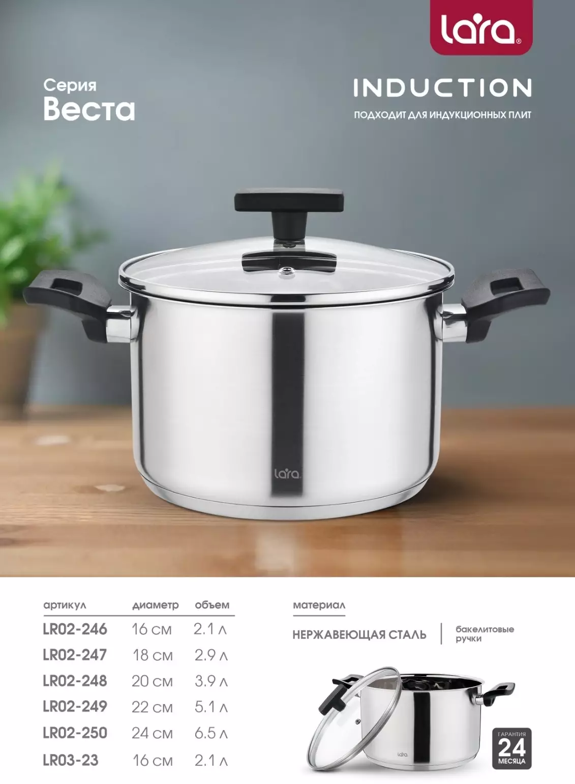 Кастрюля Lara Веста LR02-248, 3.9л, стальной