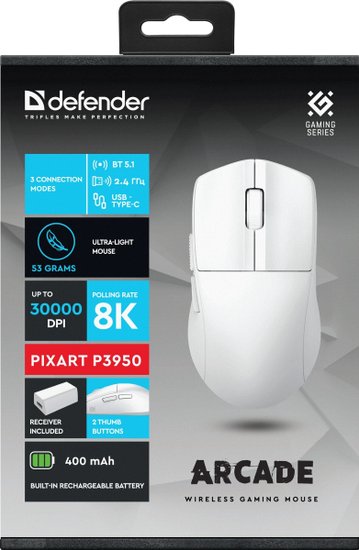 ✅Ключевые характеристикиУльтралегкая полноразмерная игровая мышь с профессиональным оптическим сенсором и максимальным разрешением до 30000 DPI подойдет для требовательных геймеров и киберспортсменов. Вес составляет всего 53 грамма, а частота опроса достигает 8000 Гц, что обеспечивает моментальную реакцию и высокую точность управления.✅Преимущества и отличияМодель выделяется универсальностью подключения:поддерживаются проводной режим через USB Type-C, беспроводная связь по Bluetooth и радиоканал 2.4 ГГц с комплектным USB-приемником. Программируемые кнопки и встроенная память позволяют настраивать мышь под индивидуальные сценарии использования, а тефлоновые ножки гарантируют легкое скольжение по любой поверхности.✅ПрактичностьАккумулятор емкостью 400 мАч обеспечивает до 120 часов автономной работы, а зарядка осуществляется через USB Type-C. Мышь совместима с Windows, Mac OS и Linux, а также поддерживает настройку DPI с предустановленными режимами для гибкой адаптации под разные задачи.✅УникальностьВ конструкции используется современный сенсор Pixart PAW3950, который обеспечивает не только высокое разрешение, но и максимальную скорость отслеживания до 750 дюймов в секунду и ускорение до 50 G. Эргономичная форма и прорезиненное колесо прокрутки делают устройство удобным для длительных игровых сессий, а ультралегкий корпус снижает усталость при активном использовании.✅Ключевые характеристикиУльтралегкая полноразмерная игровая мышь с профессиональным оптическим сенсором и максимальным разрешением до 30000 DPI подойдет для требовательных геймеров и киберспортсменов. Вес составляет всего 53 грамма, а частота опроса достигает 8000 Гц, что обеспечивает моментальную реакцию и высокую точность управления.✅Преимущества и отличияМодель выделяется универсальностью подключения:поддерживаются проводной режим через USB Type-C, беспроводная связь по Bluetooth и радиоканал 2.4 ГГц с комплектным USB-приемником. Программируемые кнопки и встроенная память позволяют настраивать мышь под индивидуальные сценарии использования, а тефлоновые ножки гарантируют легкое скольжение по любой поверхности.✅ПрактичностьАккумулятор емкостью 400 мАч обеспечивает до 120 часов автономной работы, а зарядка осуществляется через USB Type-C. Мышь совместима с Windows, Mac OS и Linux, а также поддерживает настройку DPI с предустановленными режимами для гибкой адаптации под разные задачи.✅УникальностьВ конструкции используется современный сенсор Pixart PAW3950, который обеспечивает не только высокое разрешение, но и максимальную скорость отслеживания до 750 дюймов в секунду и ускорение до 50 G. Эргономичная форма и прорезиненное колесо прокрутки делают устройство удобным для длительных игровых сессий, а ультралегкий корпус снижает усталость при активном использовании.