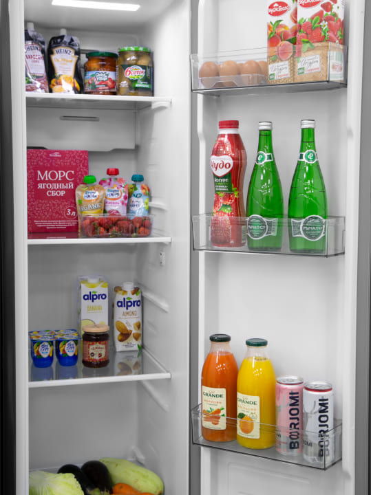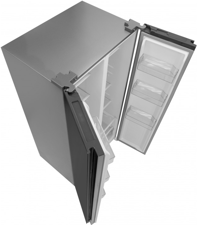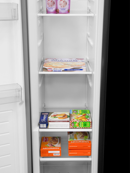 Данная модель — отдельностоящая, поэтому нужно тщательно подобрать место для ее размещения. Холодильник Side-by-Side с необычным расположением камер — сбоку друг от друга — позволяет увеличить объем продуктов для хранения. Такой вариант подходит обладателям просторной кухни, большим семьям, людям, которые запасают продукты и готовят впрок. Количество камер: 2.