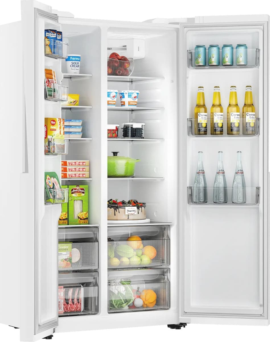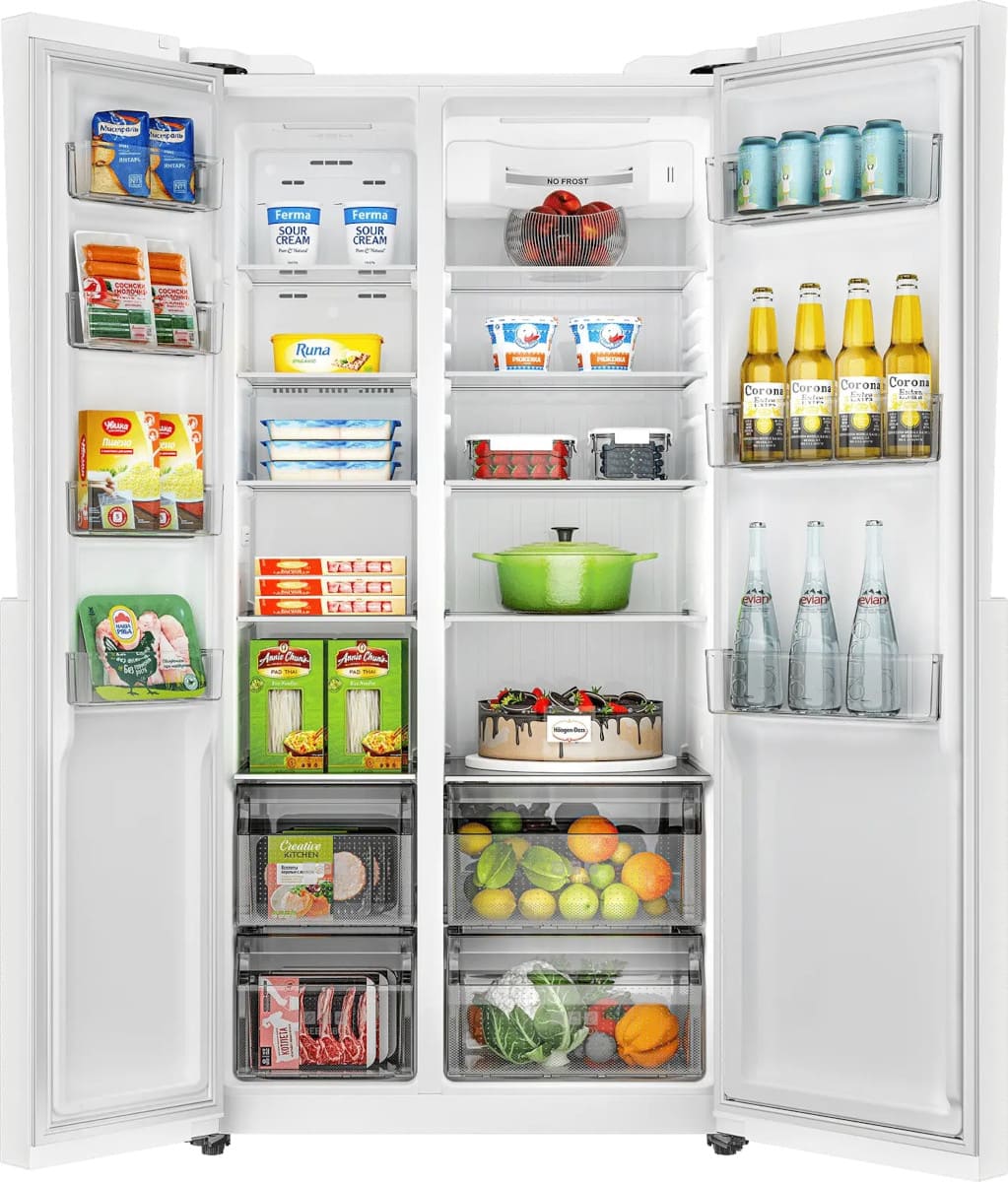 Данная модель — отдельностоящая, поэтому нужно тщательно подобрать место для ее размещения. Холодильник Side-by-Side с необычным расположением камер — сбоку друг от друга — позволяет увеличить объем продуктов для хранения. Такой вариант подходит обладателям просторной кухни, большим семьям, людям, которые запасают продукты и готовят впрок. Количество камер: 2.