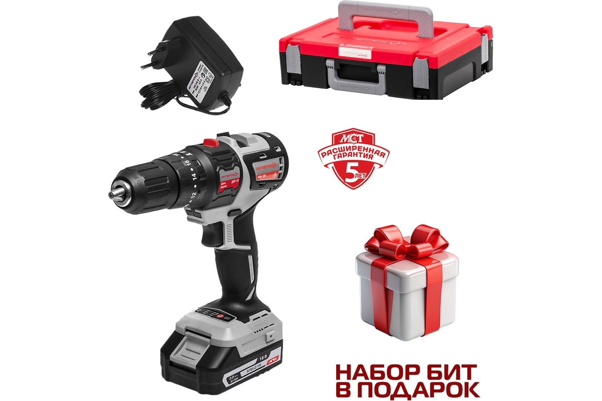 Бесщеточная аккум. ударная дрель-шуруп. Интерскол ДАУ-10/18В 44 (МБ100, 2 АКБ 2 А/ч, ЗУ) 755.2.2.47