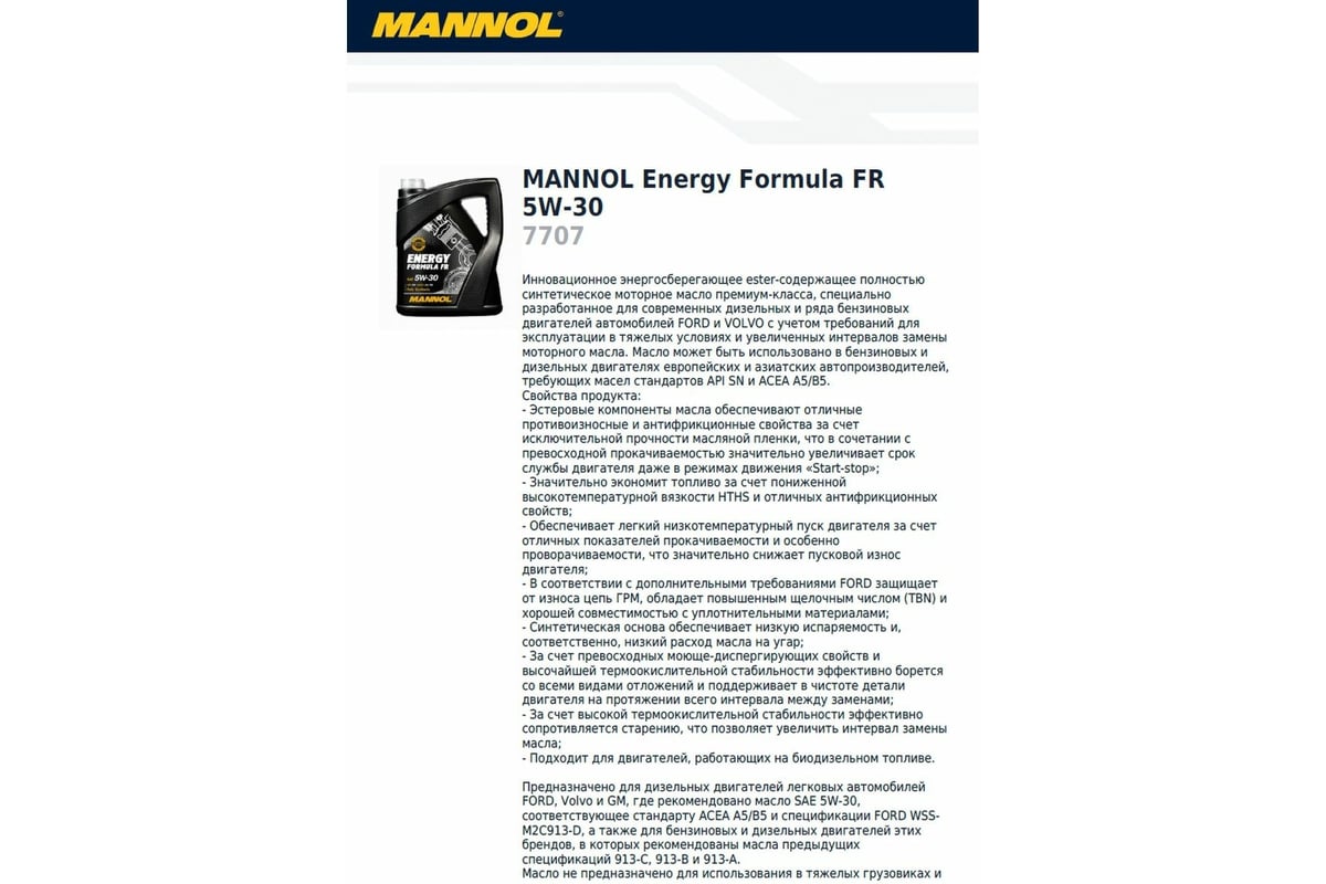 Синтетическое моторное масло MANNOL ENERGY FORMULA FR 5W-30 5 л 77075 - инновационное энергосберегающее ester-содержащее полностью синтетическое моторное масло премиум-класса, специально разработанное для современных дизельных двигателей автомобилей FORD&VOLVO с учетом требований для эксплуатации в тяжелых условиях и увеличенных интервалов замены моторного масла.