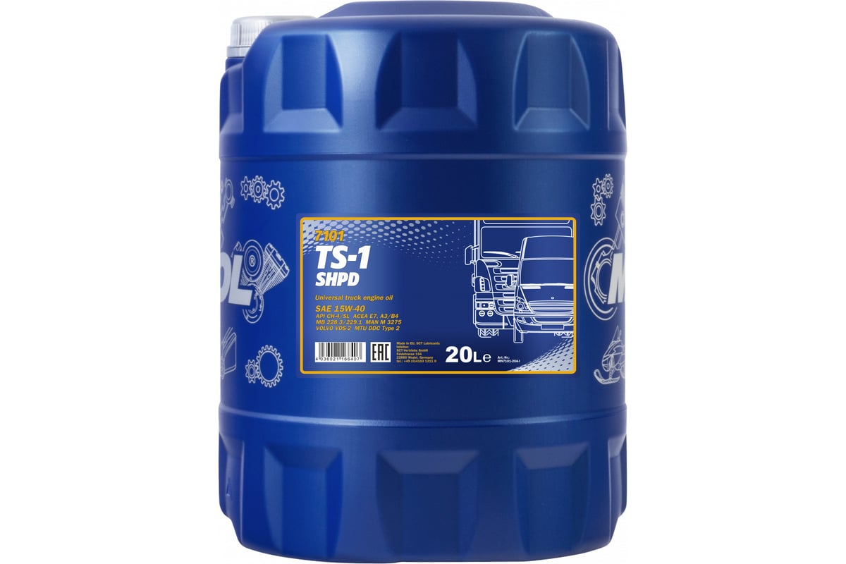 Минеральное моторное масло MANNOL TS-1 SHPD 15W40, 20 л 1253 - весезонное минеральное, с добавлением гидросинтетики, моторное масло для современных высоконагруженных и высокооборотистых дизельных двигателей с турбоннаддувом и без, работающих в тяжелых условиях. Разработано специально, чтобы обеспечить защиту техники и получить от неё максимальную отдачу вне зависимости от условий её эксплуатации.