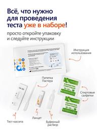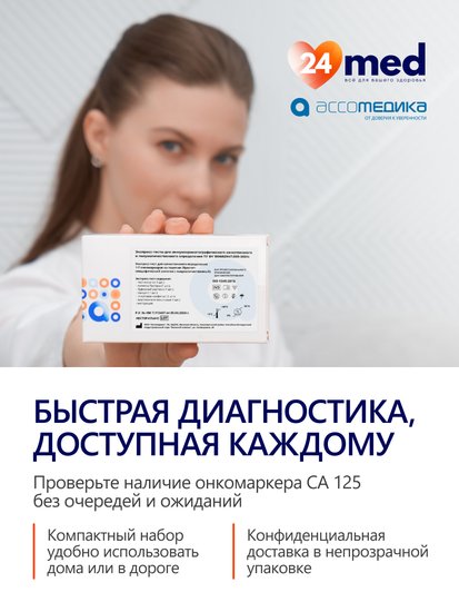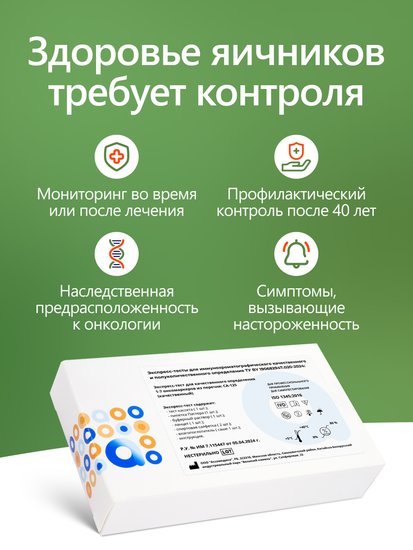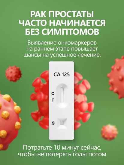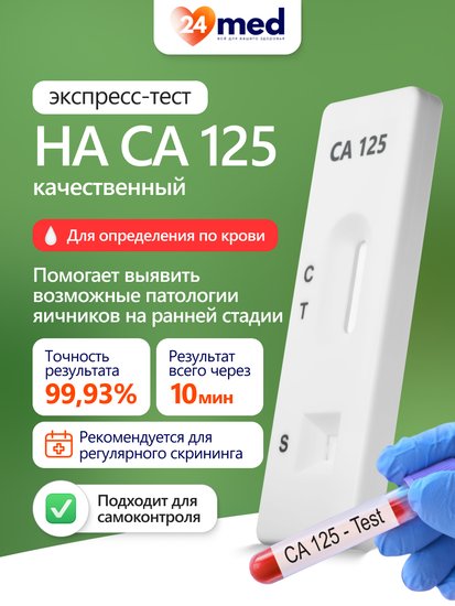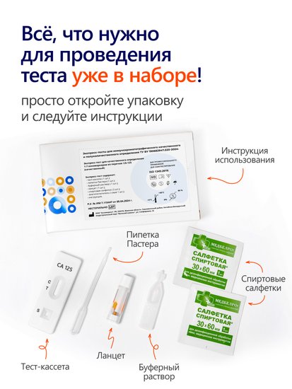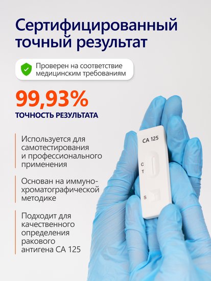 Экспресс-тест на СА 125Иммунохроматографический тест для качественного выявления ракового антигена СА 125 в капиллярной крови. Используется как вспомогательное средство при скрининге патологий, преимущественно в области женского репродуктивного здоровья. Может применяться как в клинической практике, так и в домашних условиях.Что показывает тестСА 125 – это белковый маркёр, концентрация которого может возрастать при ряде состояний, включая воспалительные процессы малого таза и онкогинекологические заболевания. Тест используется в первую очередь при подозрении на рак яичников, но также может реагировать на эндометриоз, кисты яичников и миомы. Минимальный уровень обнаружения составляет 40 МЕ/мл. Высокие диагностические характеристики (чувствительность 94,8%, точность 97,4%) позволяют применять тест для предварительной оценки и мониторинга.Как работает тестВ образце крови запускается реакция между антигеном СА 125 и реагентами, нанесёнными на тестовую мембрану. Если уровень маркера превышает диагностически значимый порог, в тестовой зоне появляется окрашенная линия. Появление второй, контрольной полоски подтверждает корректное проведение анализа.Преимущества• Удобен для самопроверки или регулярного мониторинга• Ориентирован на женское здоровье• Высокая достоверность – специфичность 98%• Результат всего за 5–10 минутКак применять1. Обработайте палец антисептиком, выполните прокол.2. Удалите первую каплю крови.3. Наберите необходимое количество в капилляр и перенесите в кассету.4. Добавьте буфер.5. Оцените результат по появлению линий через 10 минут.Дополнительная информацияПоложительный результат требует обязательной клинической интерпретации. Увеличение СА 125 не всегда связано с онкологией, уровень может временно расти при менструации, беременности или воспалениях. Отрицательный результат не исключает патологию полностью. При наличии симптомов рекомендуется консультация гинеколога и проведение УЗИ органов малого таза.Экспресс-тест на СА 125Иммунохроматографический тест для качественного выявления ракового антигена СА 125 в капиллярной крови. Используется как вспомогательное средство при скрининге патологий, преимущественно в области женского репродуктивного здоровья. Может применяться как в клинической практике, так и в домашних условиях.Что показывает тестСА 125 – это белковый маркёр, концентрация которого может возрастать при ряде состояний, включая воспалительные процессы малого таза и онкогинекологические заболевания. Тест используется в первую очередь при подозрении на рак яичников, но также может реагировать на эндометриоз, кисты яичников и миомы. Минимальный уровень обнаружения составляет 40 МЕ/мл. Высокие диагностические характеристики (чувствительность 94,8%, точность 97,4%) позволяют применять тест для предварительной оценки и мониторинга.Как работает тестВ образце крови запускается реакция между антигеном СА 125 и реагентами, нанесёнными на тестовую мембрану. Если уровень маркера превышает диагностически значимый порог, в тестовой зоне появляется окрашенная линия. Появление второй, контрольной полоски подтверждает корректное проведение анализа.Преимущества• Удобен для самопроверки или регулярного мониторинга• Ориентирован на женское здоровье• Высокая достоверность – специфичность 98%