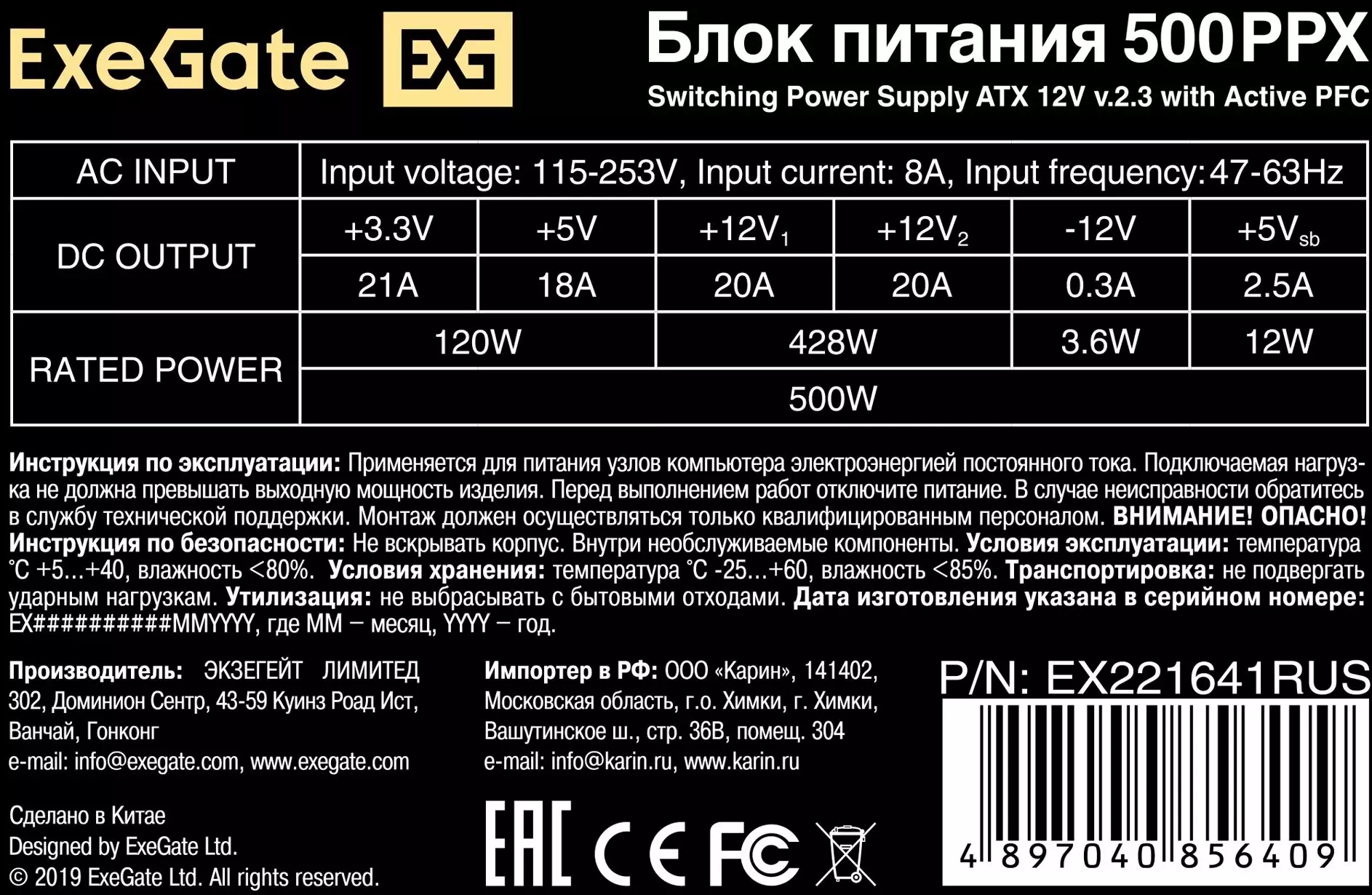 Блок питания EXEGATE 500PPX (ex221641rus)