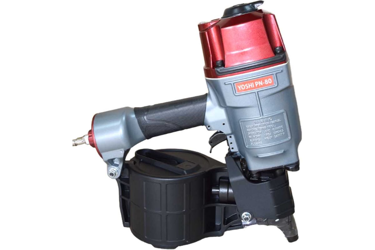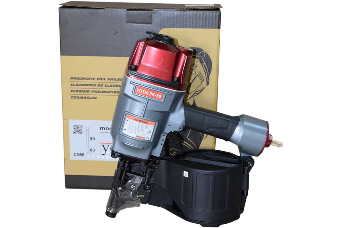 Yoshi PN-80 — это профессиональный пневматический гвоздезабивной пистолет, созданный для производств с высокой интенсивностью. Инструмент рассчитан на работу с барабанными гвоздями CNW диаметром от 2,5 до 3,3 мм, длиной от 50 до 83 мм, что позволяет надёжно фиксировать даже массивные детали.
