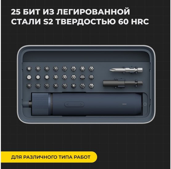 Комплектация- Аккумуляторная отвёртка- Набор из 25 бит- Упаковка