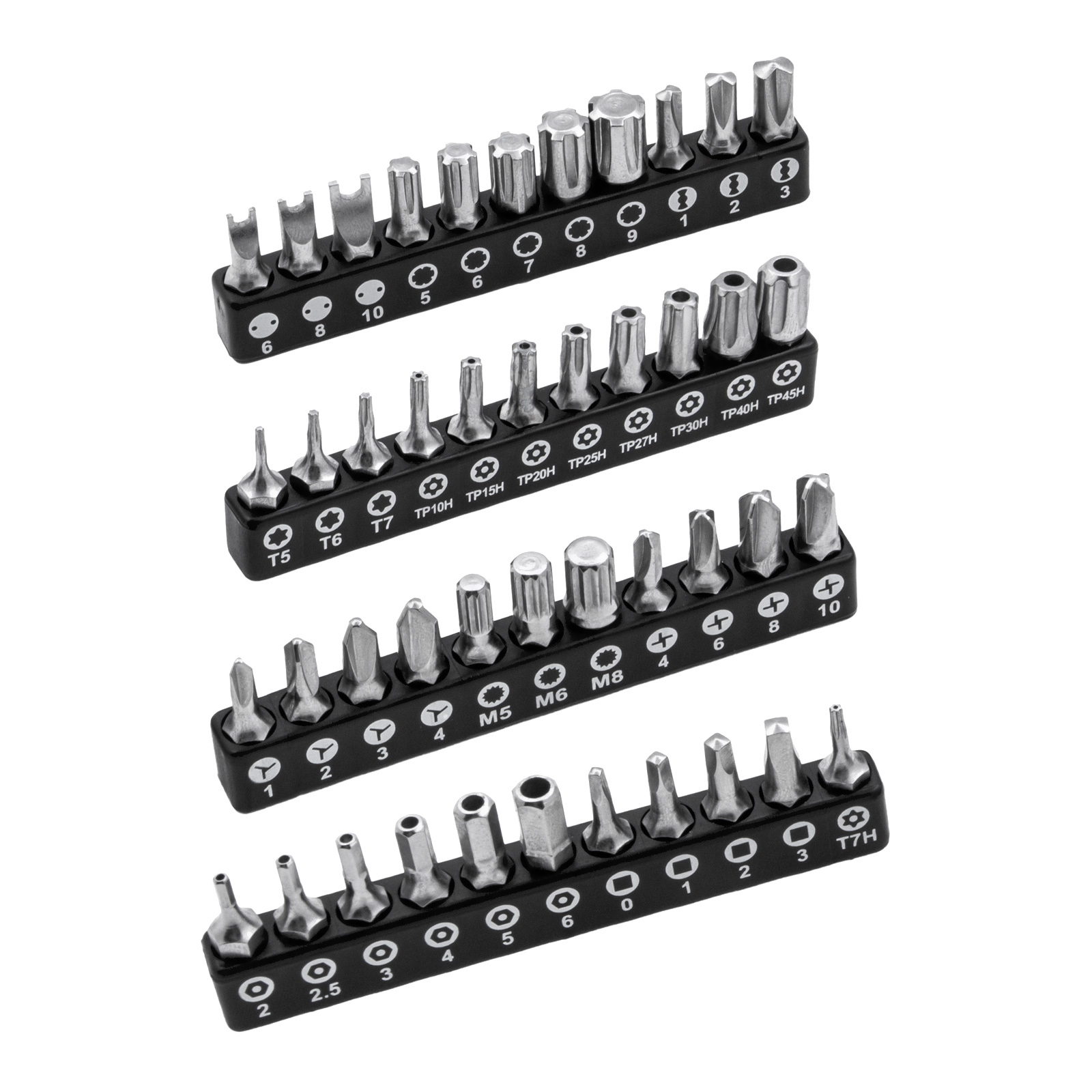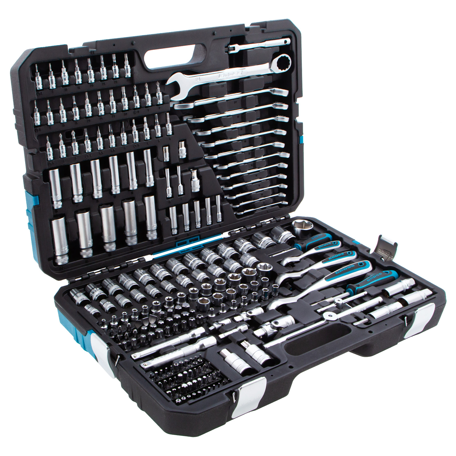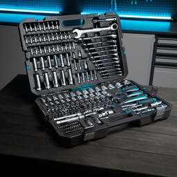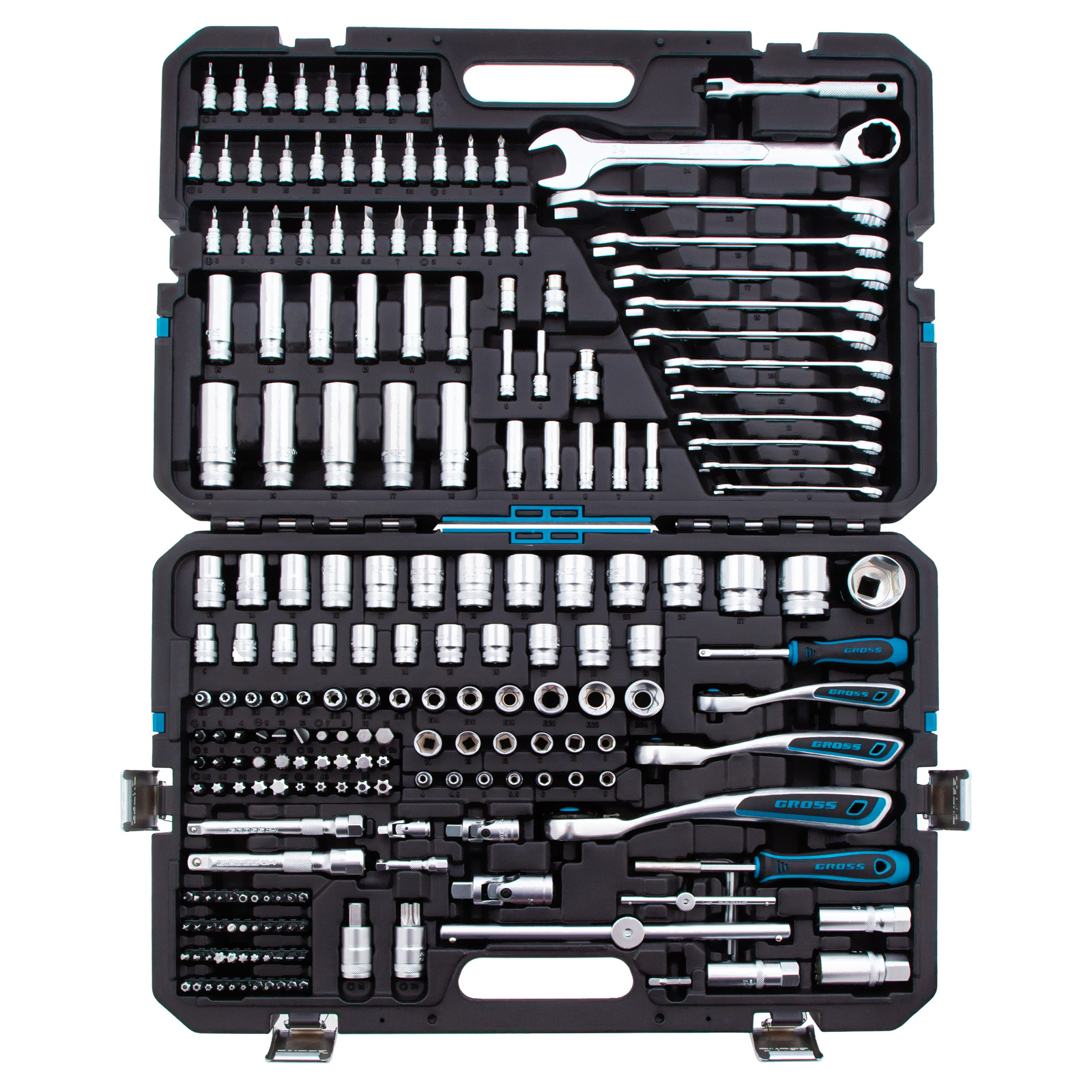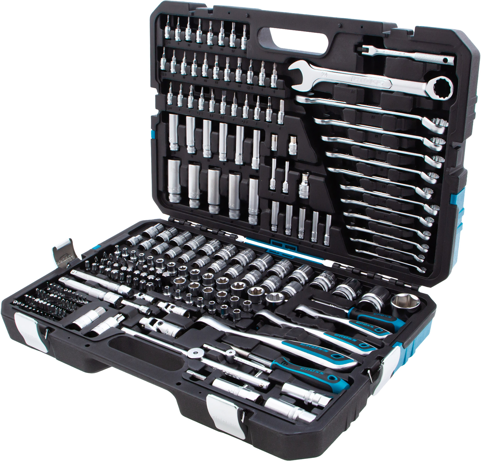 • В наборе трещотка, ключ, отвертка, вороток, удлинитель, спецголовки, биты, переходник, адаптер, кейс