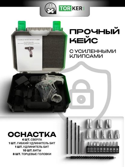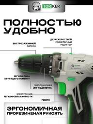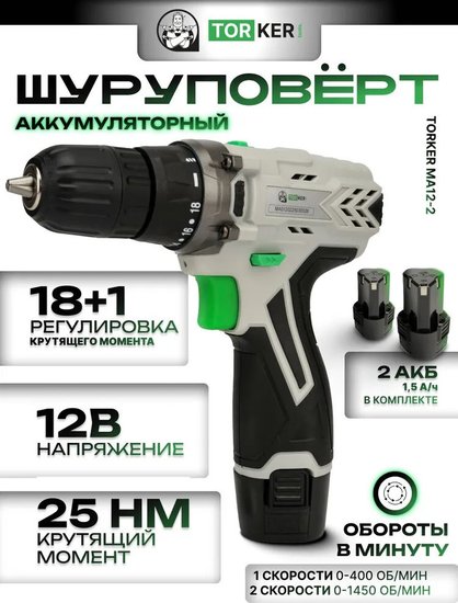 ✅Аккумуляторная дрель-шуруповерт Torker MA12-2 - это надежный инструмент для дома и дачи, предназначенный для сверления и закручивания крепежа в различных материалах. Благодаря компактному корпусу и эргономичному дизайну, инструмент удобно лежит в руке, обеспечивая комфортную работу даже при длительном использовании.✅Данная модель оснащена щеточным электродвигателем и двухскоростным редуктором, что позволяет выбрать оптимальный режим работы для разных задач. Максимальная скорость вращения достигает 1450 об/мин, а крутящий момент до 25 Н·м обеспечивает уверенное заворачивание и выкручивание шурупов и саморезов.✅В комплекте идут сразу два литий-ионных аккумулятора емкостью 1.5 А·ч и напряжением 12 В, что позволяет работать без длительных перерывов на подзарядку. Быстрозажимной патрон обеспечивает легкую смену оснастки, а наличие реверса и электронной регулировки оборотов позволяет точно контролировать процесс.✅Дрель-шуруповерт удобно брать с собой благодаря кейсу, в котором также находятся биты, головки, сверла, удлинитель бит и гибкий вал. Модель оснащена подсветкой и функцией фиксации шпинделя, что делает работу с инструментом еще более удобной и безопасной.✅Аккумуляторная дрель-шуруповерт Torker MA12-2 - это надежный инструмент для дома и дачи, предназначенный для сверления и закручивания крепежа в различных материалах. Благодаря компактному корпусу и эргономичному дизайну, инструмент удобно лежит в руке, обеспечивая комфортную работу даже при длительном использовании.✅Данная модель оснащена щеточным электродвигателем и двухскоростным редуктором, что позволяет выбрать оптимальный режим работы для разных задач. Максимальная скорость вращения достигает 1450 об/мин, а крутящий момент до 25 Н·м обеспечивает уверенное заворачивание и выкручивание шурупов и саморезов.✅В комплекте идут сразу два литий-ионных аккумулятора емкостью 1.5 А·ч и напряжением 12 В, что позволяет работать без длительных перерывов на подзарядку. Быстрозажимной патрон обеспечивает легкую смену оснастки, а наличие реверса и электронной регулировки оборотов позволяет точно контролировать процесс.✅Дрель-шуруповерт удобно брать с собой благодаря кейсу, в котором также находятся биты, головки, сверла, удлинитель бит и гибкий вал. Модель оснащена подсветкой и функцией фиксации шпинделя, что делает работу с инструментом еще более удобной и безопасной.