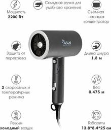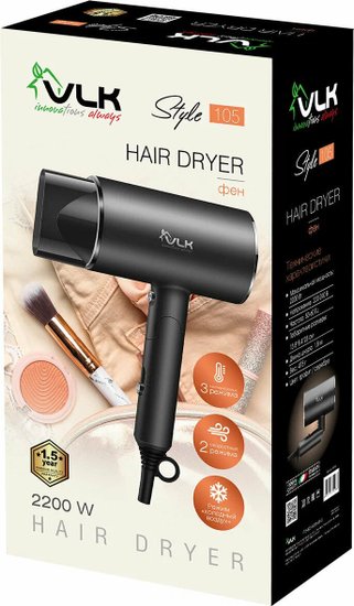 Искали фен, который будет сочетать в себе стиль, мощь и функциональность и при этом оставаться компактным? Тогда фен для волос VLK STYLE-105 — идеальное решение для вас.Мощность VLK STYLE-105 2200 Вт позволяет быстро высушить волосы любой густоты. Наличие 2 скоростных и 3 температурных режимов поможет вам выбрать лучшие условия для создания идеальной прически, а режим «холодный воздух» — зафиксировать укладку. Сделать волосы гладкими можно благодаря сушке со съемным концентратором. Защита от перегрева помогает избежать поломок устройства и защитить волосы от перегрева.У VLK STYLE-105 удобная посадка в руке и комфортный вес фена (475 г). Свободу движений обеспечивает оптимальная длина шнура — 1,8 метра.Организовать удобное хранение позволяют складывающаяся ручка фена и петелька для подвешивания.Черная цветовая гамма фена выглядит стильно и привлекательно. Лаконичный дизайн без лишних деталей делает фен не только красивым, но и практичным.Легкость, мощность, стиль! Все самое лучшее собрано в фене для волос VLK STYLE-105!Искали фен, который будет сочетать в себе стиль, мощь и функциональность и при этом оставаться компактным? Тогда фен для волос VLK STYLE-105 — идеальное решение для вас.Мощность VLK STYLE-105 2200 Вт позволяет быстро высушить волосы любой густоты. Наличие 2 скоростных и 3 температурных режимов поможет вам выбрать лучшие условия для создания идеальной прически, а режим «холодный воздух» — зафиксировать укладку. Сделать волосы гладкими можно благодаря сушке со съемным концентратором. Защита от перегрева помогает избежать поломок устройства и защитить волосы от перегрева.У VLK STYLE-105 удобная посадка в руке и комфортный вес фена (475 г). Свободу движений обеспечивает оптимальная длина шнура — 1,8 метра.Организовать удобное хранение позволяют складывающаяся ручка фена и петелька для подвешивания.Черная цветовая гамма фена выглядит стильно и привлекательно. Лаконичный дизайн без лишних деталей делает фен не только красивым, но и практичным.Легкость, мощность, стиль! Все самое лучшее собрано в фене для волос VLK STYLE-105!